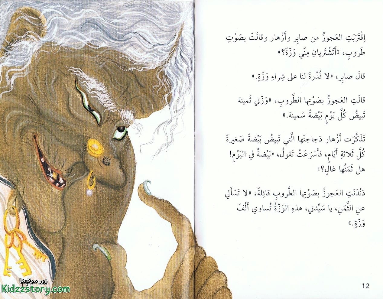 دندنت العجوز بصوتها الطروب قائلة، “لا تسألي عن الثمن يا سيدتي، هذه الوزة تساوي ألف وزة.”