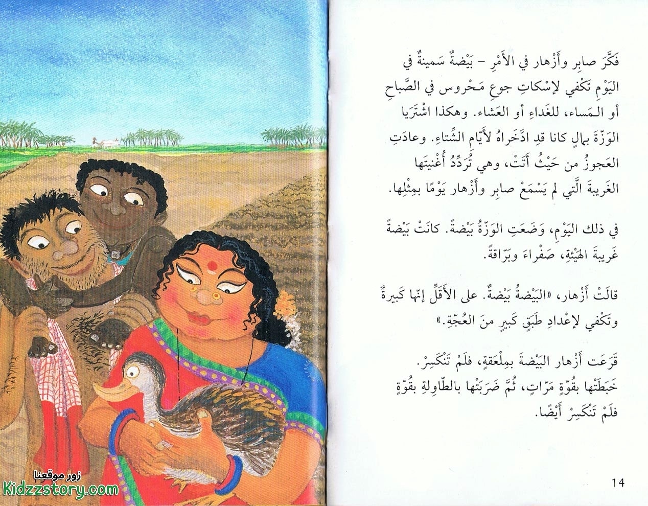 في ذلك اليوم، وضعت الوزة بيضة. كانت بيضة غريبة الهيئة، صفراء وبرّاقة. قالت أزهار، “البيضة بيضة، على الأقل إنها كبيرة وتكفي لإعداد طبق كبير من العجة.”