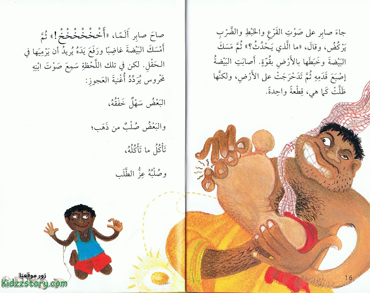 جاء صابر على صوت القرع والخبْط والضرب يركض، وقال، “ما الذي يحدث؟” ثم مسك البيضة وخبطها بالأرض بقوة. أصابت البيضة إصبع قدمه ثم تدحرجت على الأرض، لكنها ظلت كما هي، قطعة واحدة.