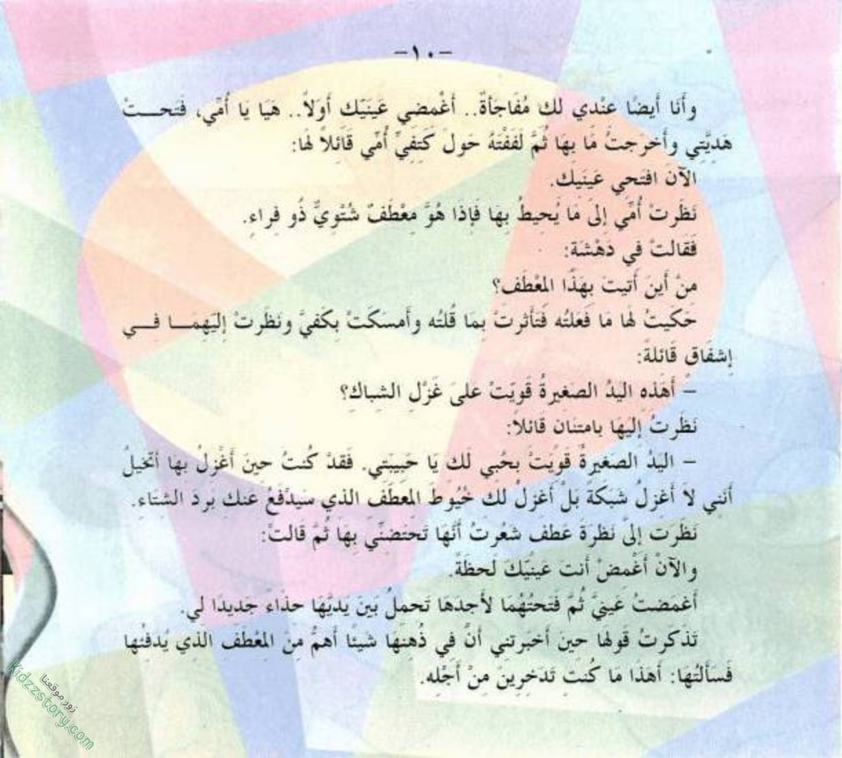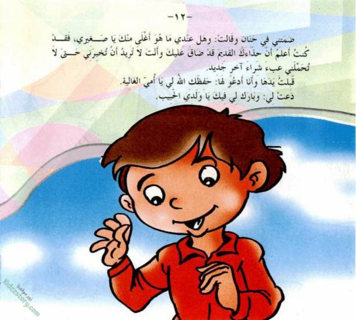 ضمتني في حنان وقالت: “وهل عندي ما هو أغلى منك يا صغيري، فقد كنت أعلم أن حذاءك القديم قد ضاق عليك وأنت لا تريد أن تخبرني حتى لا تحملني عبء شراء آخر جديد.”