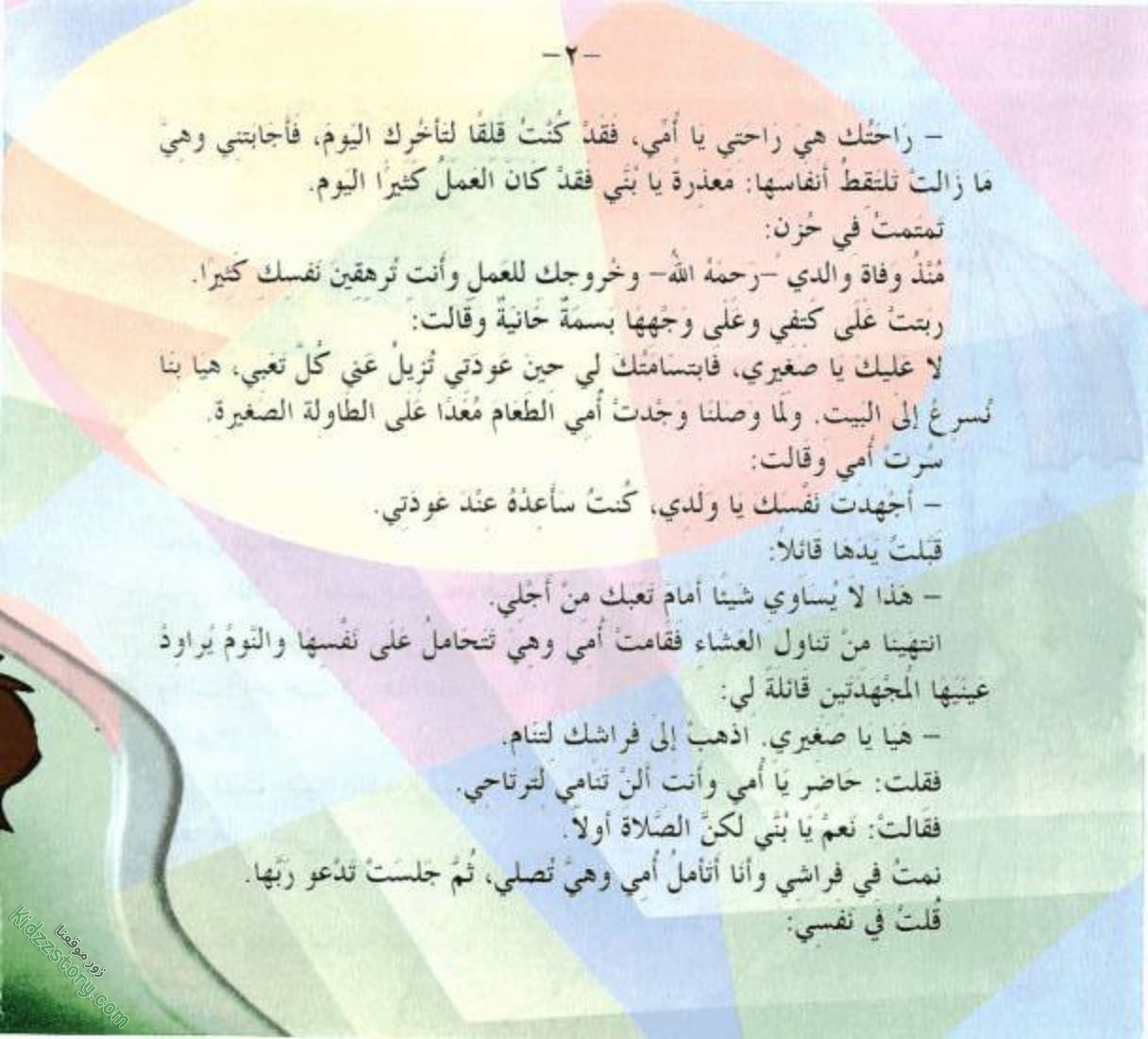 غلبني النوم فلم أشعر إلا بقبلة أمي التي تطبعها على جبيني كل صباح وعبارتها الرقيقة: “صباح الخير والسرور يا ولدي الحبيب.”