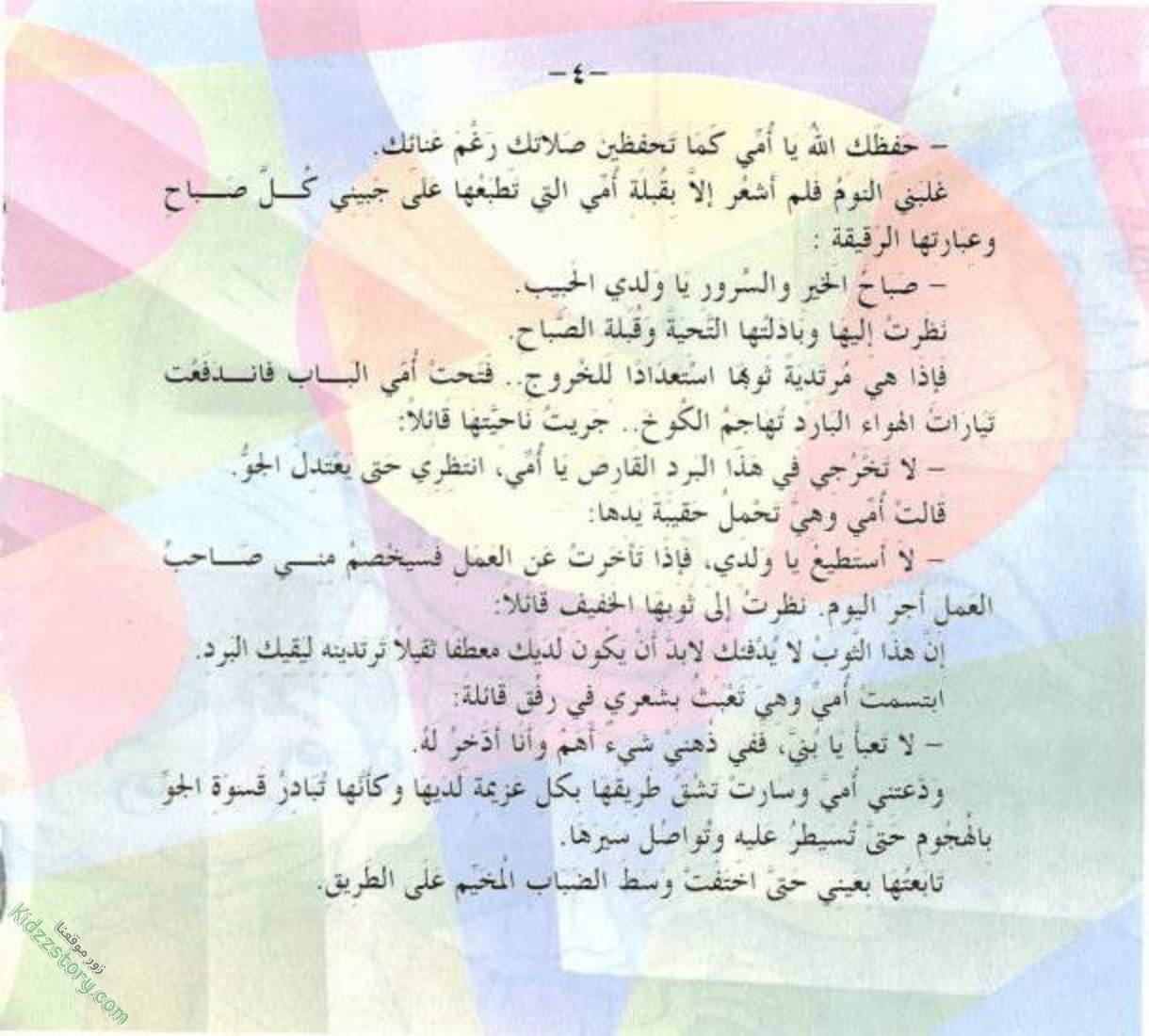 ربتت على كتفي وعلى وجهها بسمة حانية وقالت: “لا عليك يا صغيري، فابتسامتك لي حين عودتي تزيل عني كل تعبي، هيا بنا نسرع إلى البيت.”