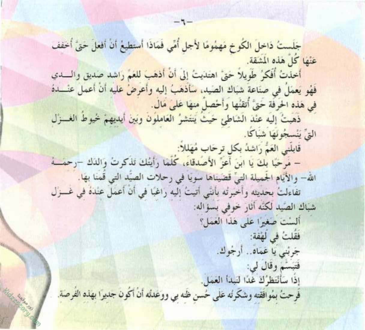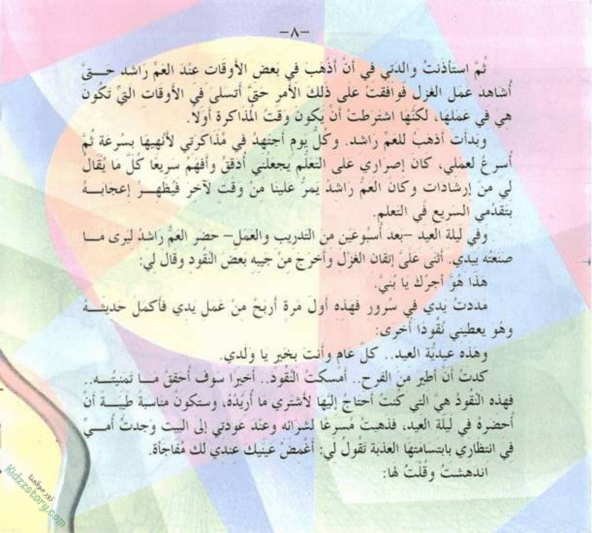وفي ليلة العيد – بعد أسبوعين من التدريب والعمل- حضر العم راشد ليرى ما صنعت يداي، أثنى على إتقان الغزل وأخرج من جيبه بعض النقود وقال لي: “هذا هو أجرك يا بني.”