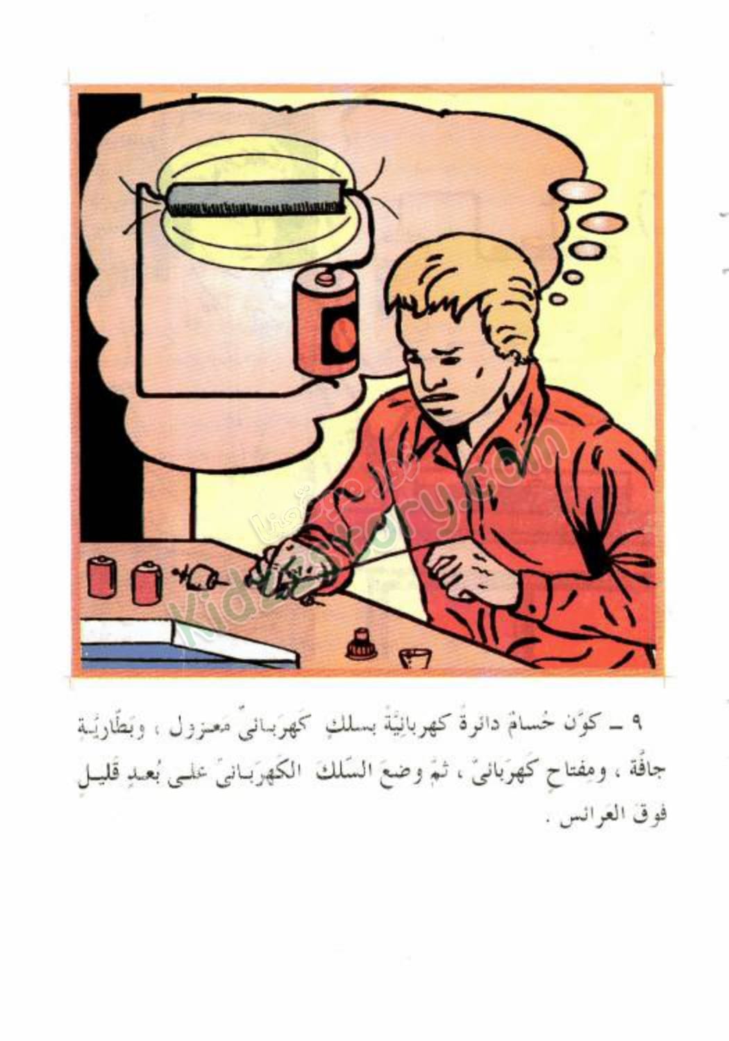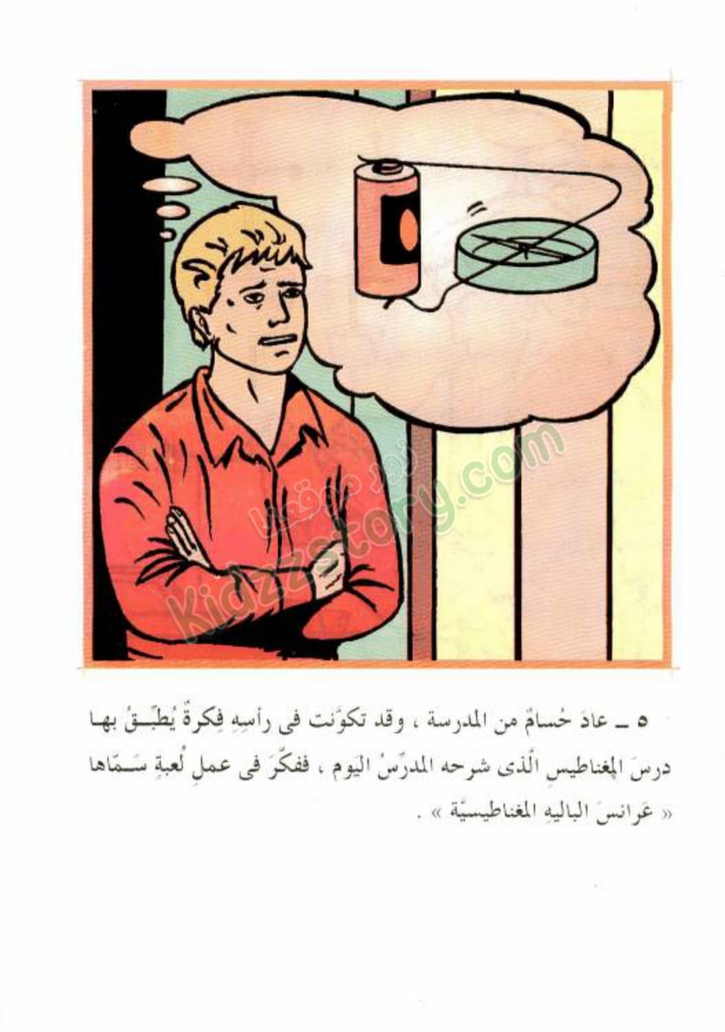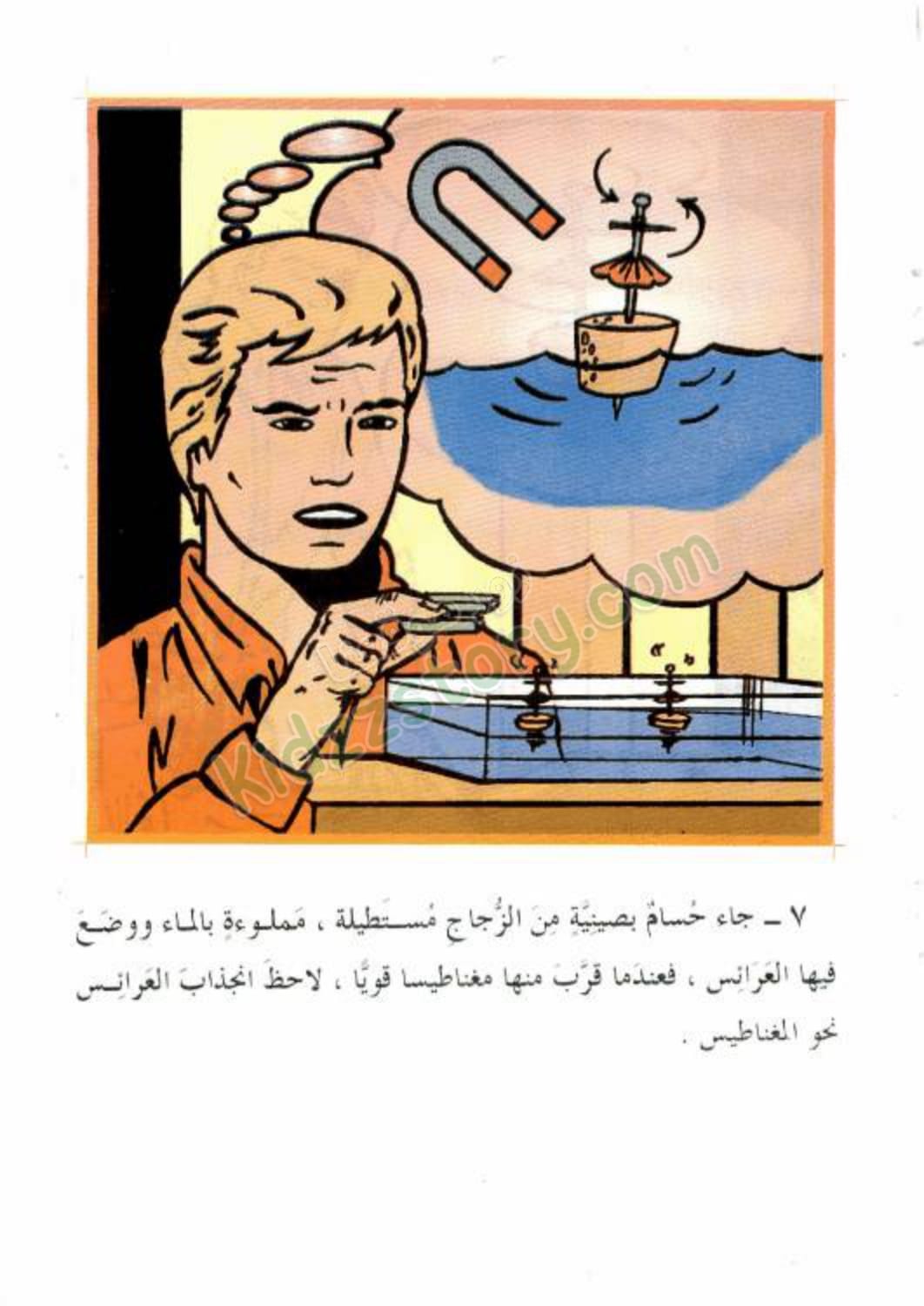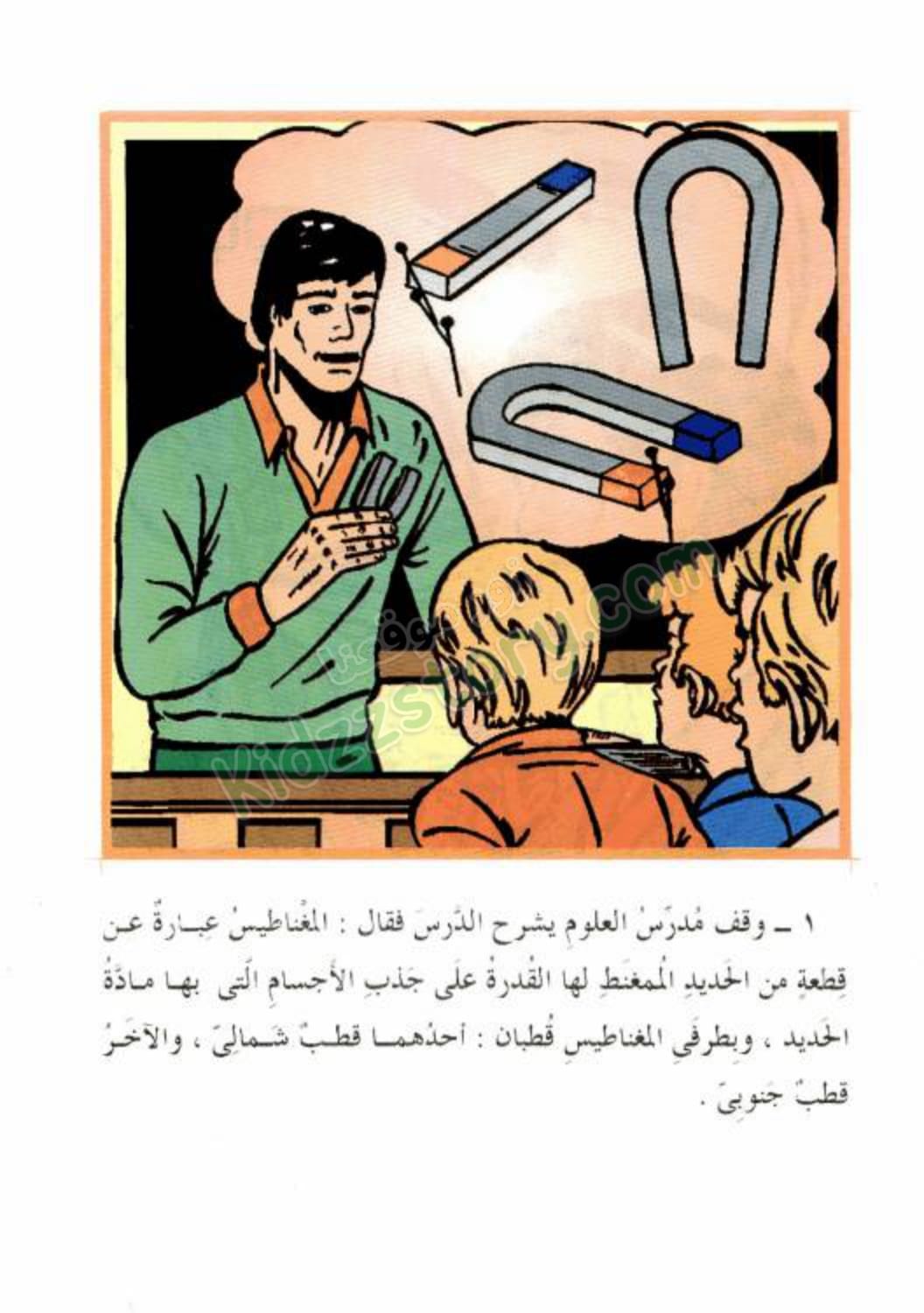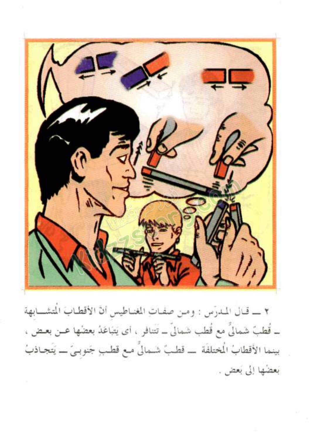 قال المدرس: “ومن صفات المغناطيس أن الأقطاب المتشابهة – قطب شمالي مع قطب شمال – تتنافر، أيّ يتباعد بعضها عن بعض، بينما الأقطاب المختلفة – قطب شمالي مع قطب جنوبي – تتجاذب بعضها إلى بعض.”