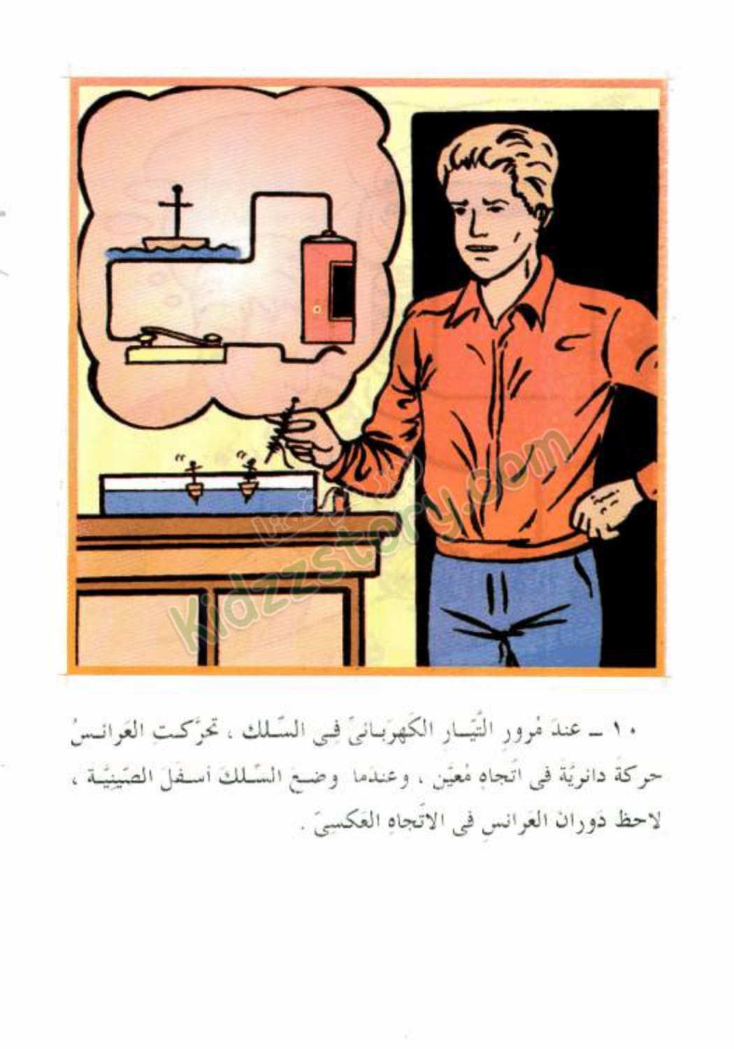 كوّن حسام دائرة كهربائية بسلك كهربائي معزول، وبطارية جافة، ومفتاح كهربائي، ثم وضع السلك الكهربائي على بعد قليل فوق العرائس. عند مرور التيار الكهربائي في السلك، تحركت العرائس حركة دائرية في اتجاه معين، وعندما وضع السلك أسفل الصينية لاحظ دوران العرائس في الاتجاه العكسي.