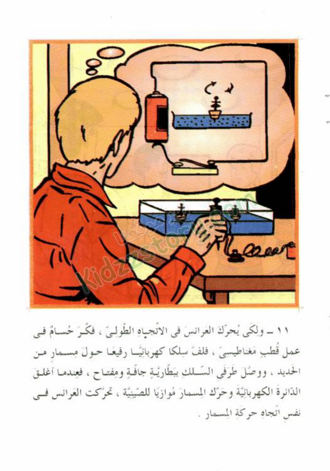 ولكي يحرك العرائس في الاتجاه الطولي، فكر حسام في عمل قطب مغناطيسي، فلف سلكا كهربائيًا رفيعًا حول مسمار من الحديد، ووصل طرفي السلك ببطارية جافة ومفتاح، فعندما أغلق الدائرة الكهربائية وحرك المسمار موازيًا للصينية، تحركت العرائس في نفس اتجاه حركة المسمار.