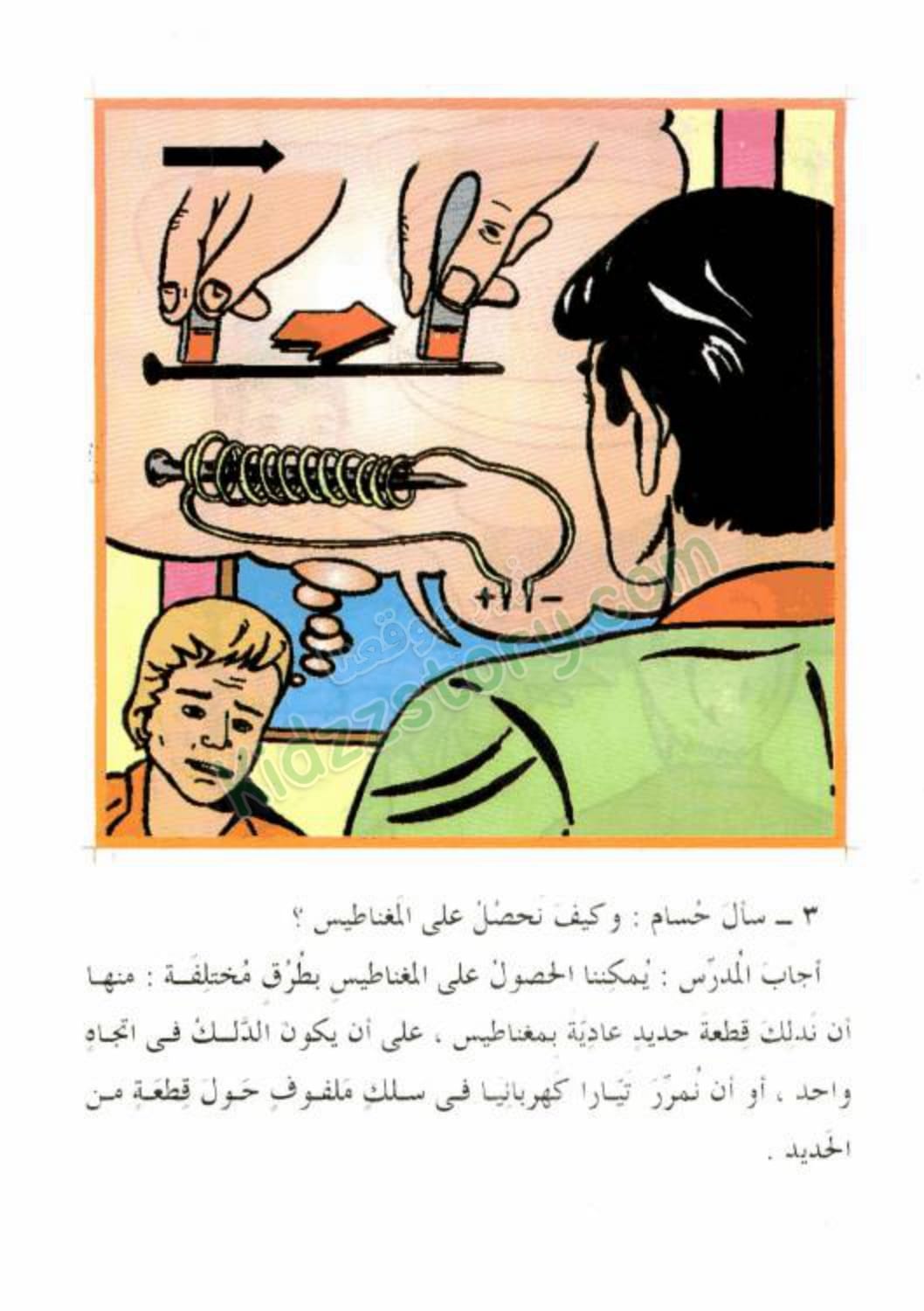 سأل حسام: “وكيف نحصل على المغناطيس؟”. أجاب المدرس: “يمكننا الحصول على المغناطيس بطرق مختلفة: منها أن ندلك قطعة حديد عادية بمغناطيس، على أن يكون الدلك في اتجاه واحد، أو أن نمرر تيارًا كهربائيًا في سلك ملفوف حول قطعة من الحديد.”