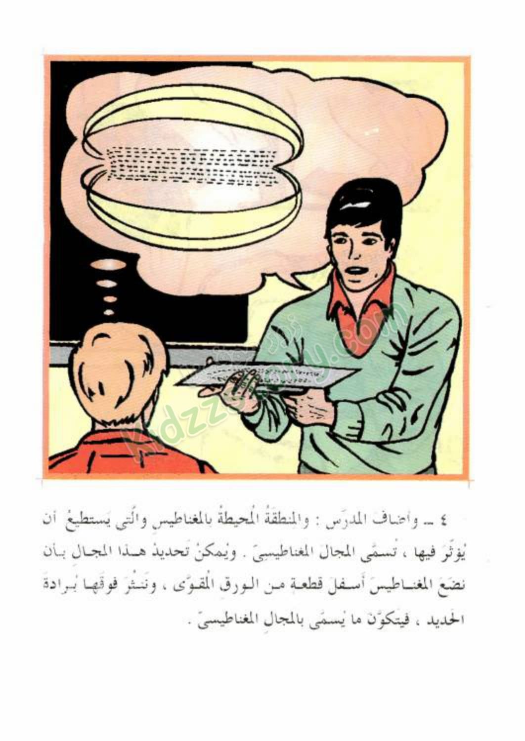وأضاف المدرس: “والمنطقة المحيطة بالمغناطيس والتي يستطيع أن يؤثر فيها، تُسمى المجال المغناطيسي. ويمكن تحديد هذا المجال بأن نضع المغناطيس أسفل قطعة من الورق المقوى، وننثر فوقها برادة الحديد. فيتكون ما يسمى بالمجال المغناطيسي.”