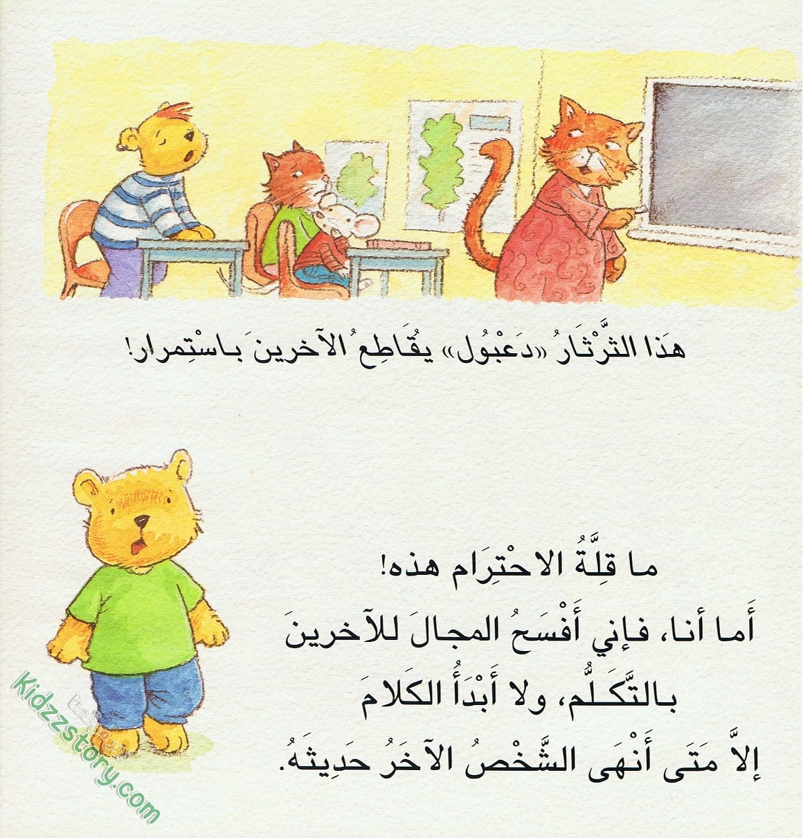 هذا الثرثار «دعبول» يقاطع الآخرين باستمرار! ما قلة الاحترام هذه! أما أنا، فإني أفسح المجال للآخرين بالتكلم، ولا أبدأ الكلام إلا متى أنهى الشخص الآخر حديثه.