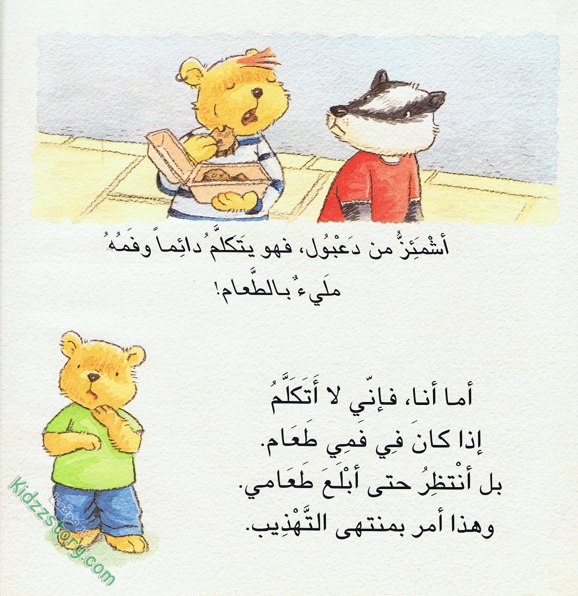 أشمئز من دعبول، فهو يتكلم دائما وفمه مليء بالطعام! أما أنا، فإني لا أتكلم إذا كان في فمي طعام. بل أنتظر حتى أبلع طعامي. وهذا أمر بمنتهى التهذيب.