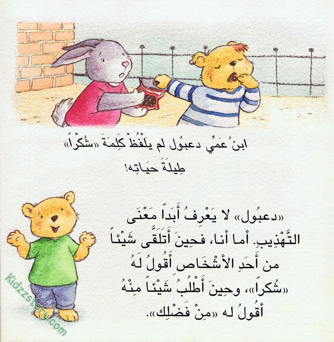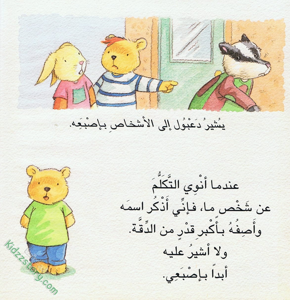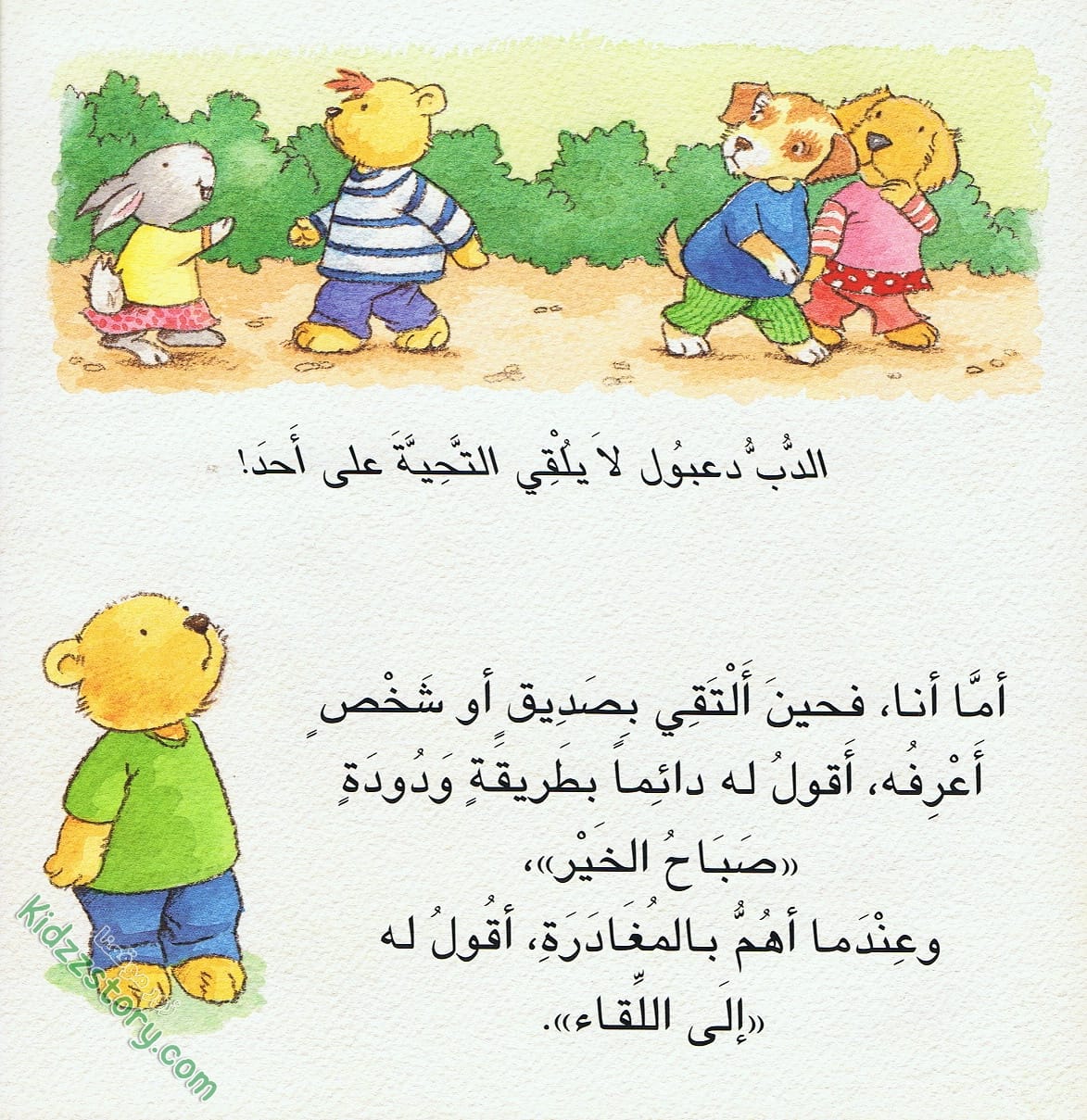الدب دعبول لا يلقي التحية على أحد. أما أنا، فحين ألتقي بصديق أو شخص أعرفه، أقول له دائما بطريقة ودودة «صباح الخير»، وعندما أهم بالمغادرة، أقول له «إلى اللقاء».