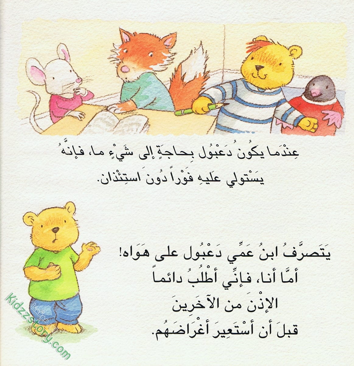 وعندما يكون دعبول بحاجة إلى شيء ما، فإنه يستولي عليه فورا دون استئذان. يتصرف ابن عمي دعبول على هواه! أما أنا، فإني أطلب دائما الإذن من الآخرين قبل أن أستعير أغراضهم.