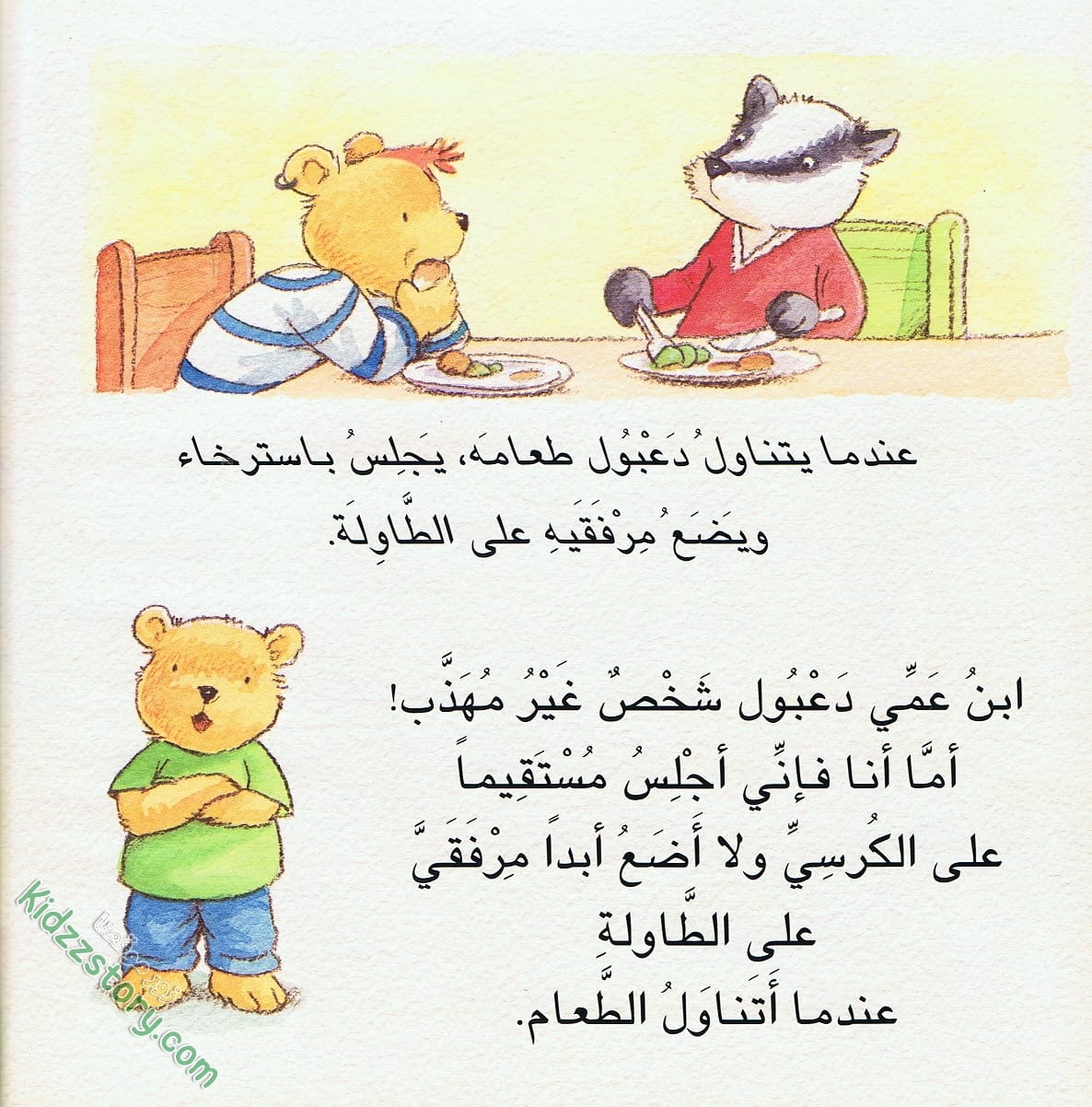 عندما يتناول دعبول طعامه، يجلس باسترخاء ويضع مرفقيه على الطاولة. وابن عمي دعبول شخص غير مهذب. أما أنا فإني أجلس مستقيما على الكرسي ولا أضع أبدا مرفقي على الطاولة عندما أتناول الطعام.