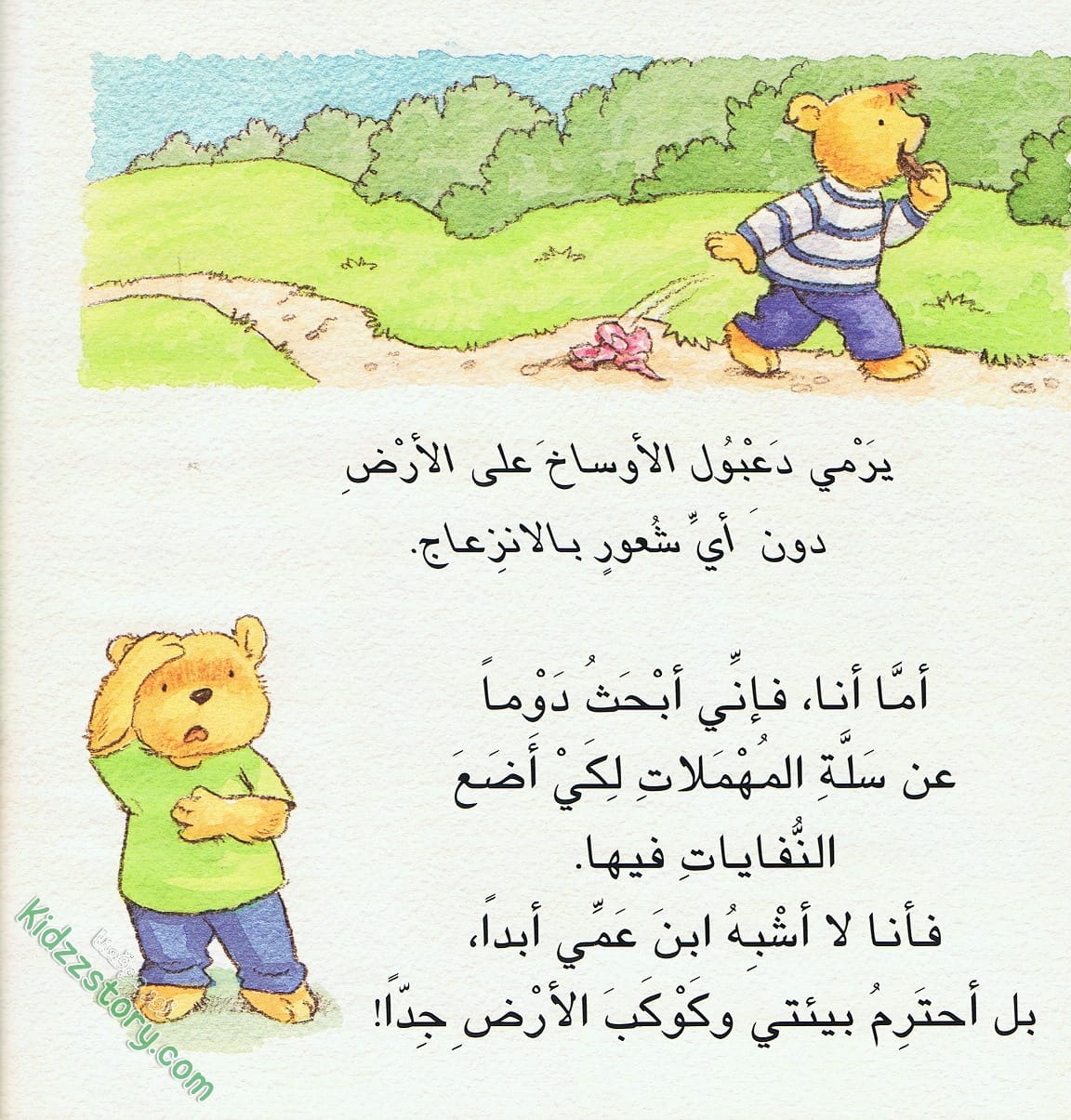 يرمي دعبول الأوساخ على الأرض دون أي شعور بالانزعاج. أما أنا، فإني أبحث دوما عن سلة المهملات لكي أضع النفايات فيها. فأنا لا أشبه ابن عمي أبدا، بل أحترم بيئتي وكوكب الأرض جدا!