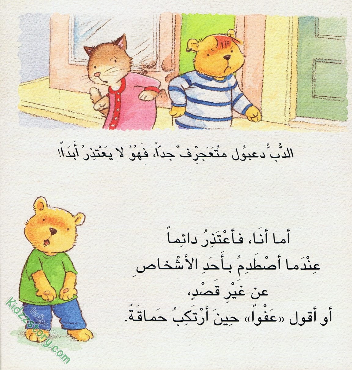 الدب دعبول متعجرف جدا، فهو لا يعتذر أبدا! أما أنا، فأعتذر دائما عندما أصطدم بأحد الأشخاص عن غير قصد، أو أقول «عفوا» حين أرتكب حماقة.