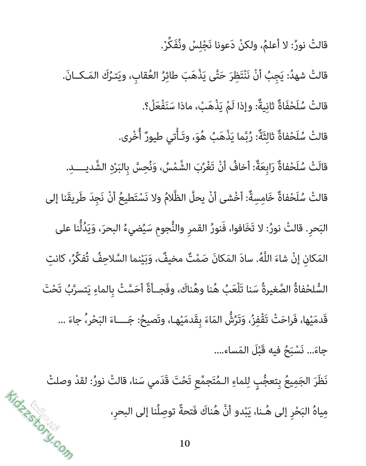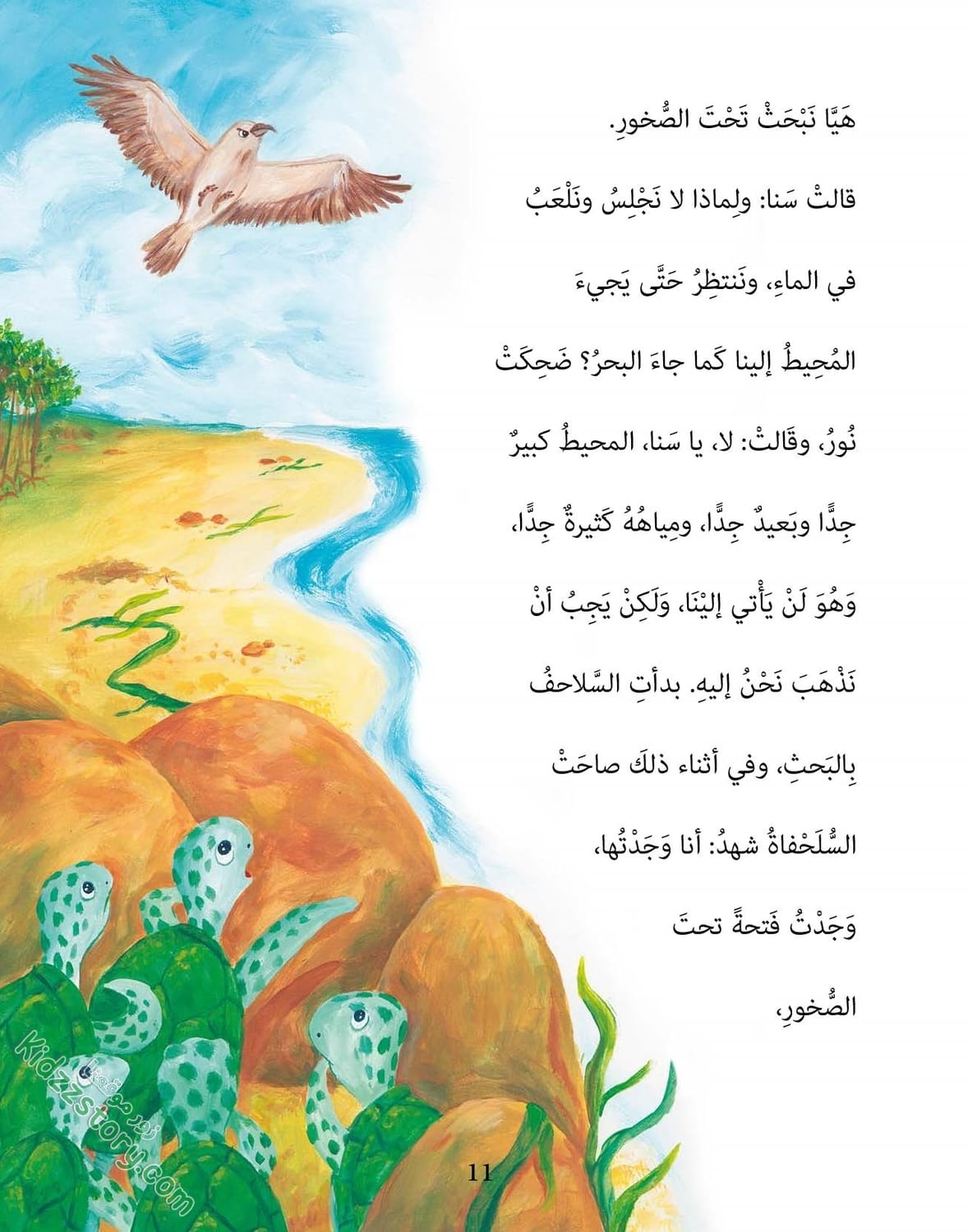 ضحكت نور وقالت: “لا يا سنا، المحيط كبير جدا وبعيد جدا، ومياهه كثيرة جدا، وهو لن يأتي إلينا، ولكن يجب أن نذهب نحن إليه.”