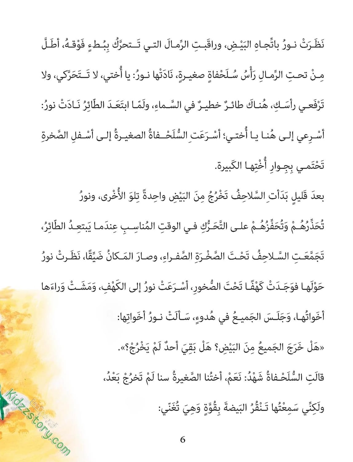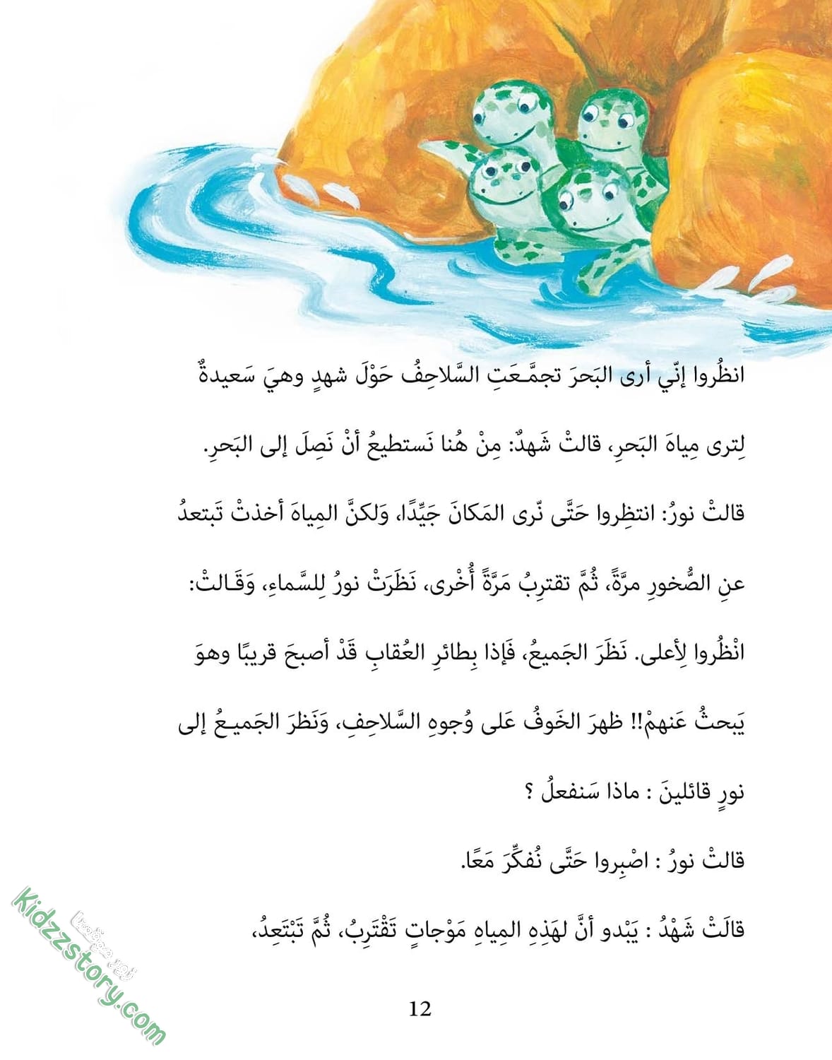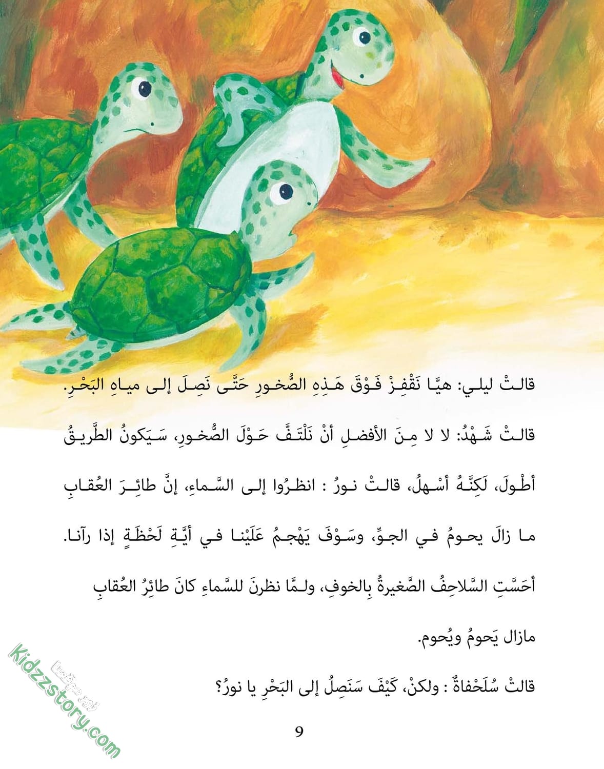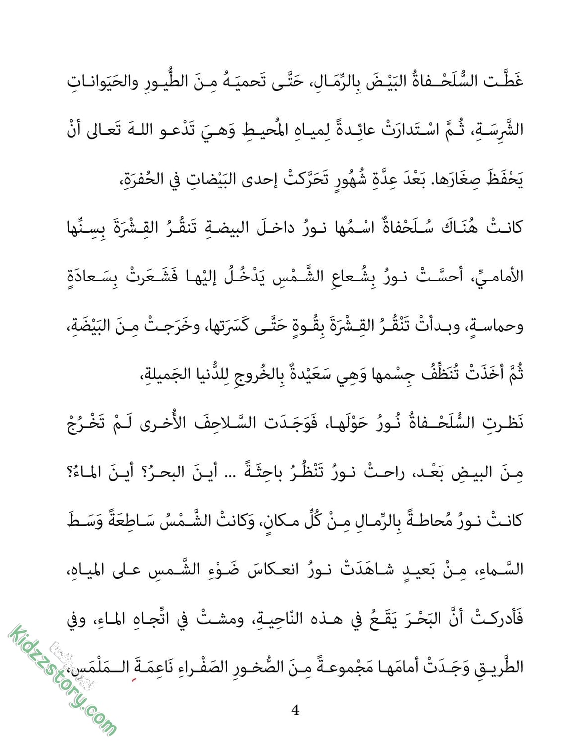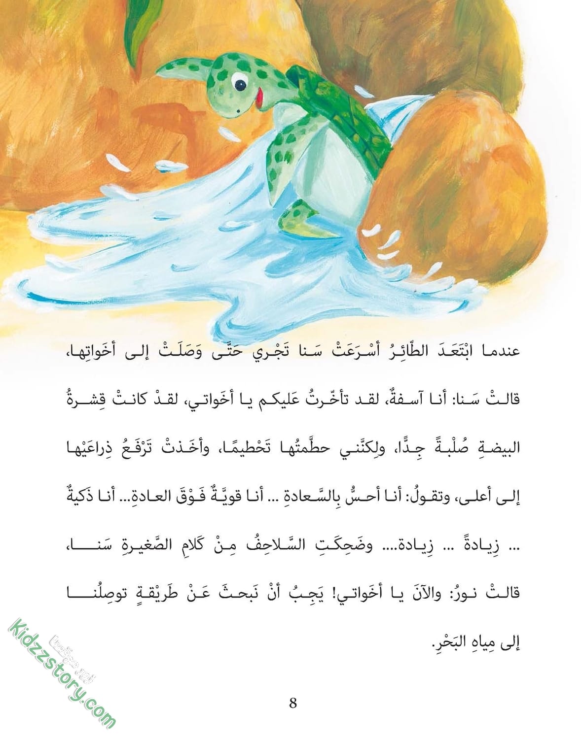 بعد عدة شهور، تحركت إحدى البيضات في الحفرة. كانت هناك سلحفاة اسمها نور داخل البيضة تنقر القشرة بسنها الأمامي. أحست نور بشعاع الشمس يدخل إليها فشعرت بسعادة وحماسة، وبدأت تنقر القشرة بقوة حتى كسرتها وخرجت من البيضة. ثم أخذت تنفض جسمها وهي سعيدة بالخروج للدنيا الجميلة. نظرت السلحفاة نور حولها فوجدت السلاحف الأخرى لم تخرج من البيض بعد. راحت نور تنظر باحثة: “أين البحر؟ أين الماء؟”