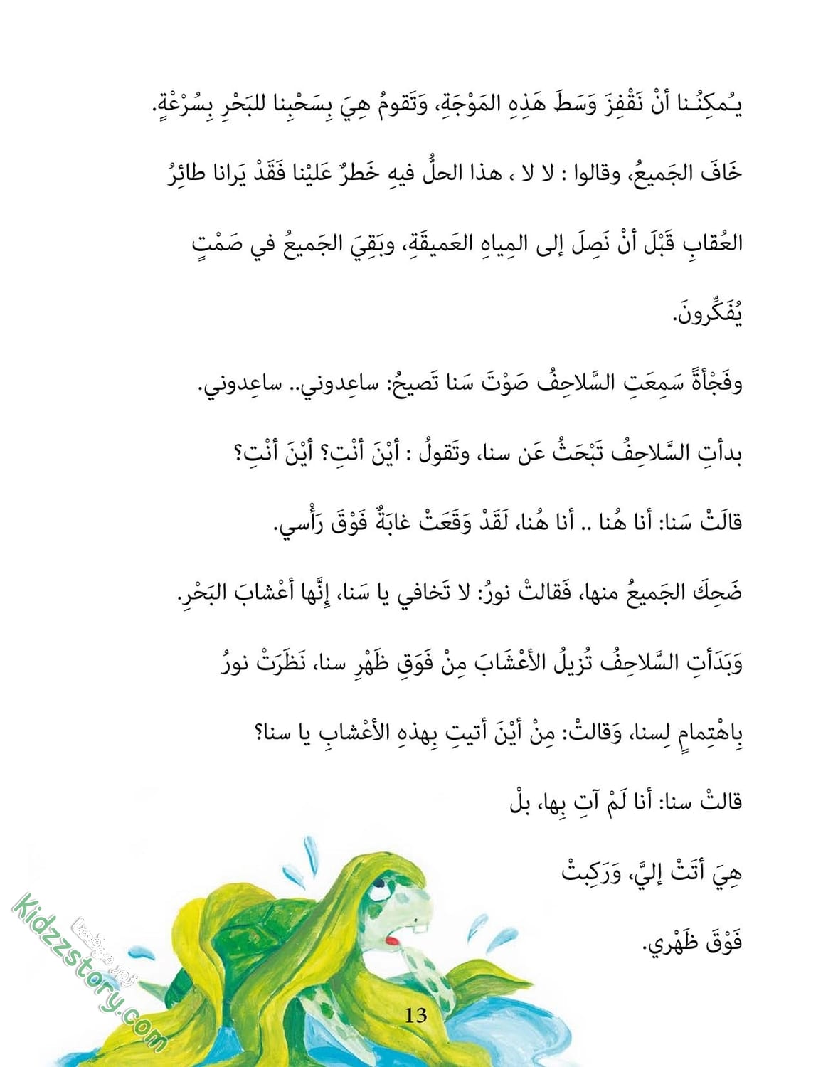 وبدأت السلاحف تزيل الأعشاب من فوق ظهر سنا. نظرت نور باهتمام لسنا، وقالت: “من أين أتيت بهذه الأعشاب يا سنا؟”