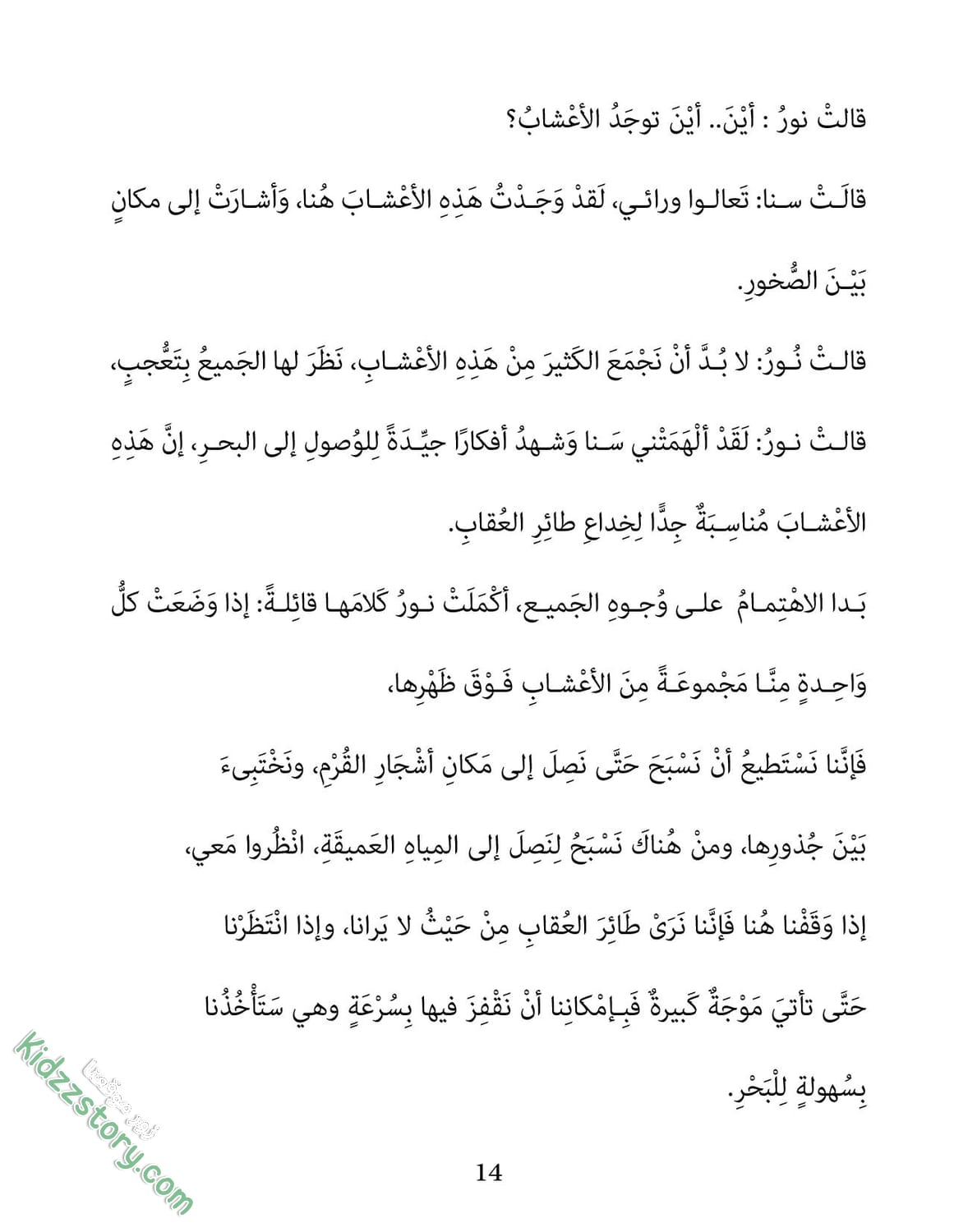بدا الاهتمام على وجوه الجميع. أكملت نور كلامها قائلة: “إذا وضعت كل واحدة منا مجموعة من الأعشاب فوق ظهرها، فإننا نستطيع أن نسبح حتى نصل إلى مكان أشجار القرم، ونختبئ بين جذورها، ومن هناك نسبح لنصل إلى المياه العميقة. انظروا معي، إذا وقفنا هنا فإننا نرى طائر العقاب من حيث لا يرانا، وإذا انتظرنا حتى تأتي موجة كبيرة فبإمكاننا أن نقفز فيها بسرعة وهي ستأخذنا بسهولة للبحر.”