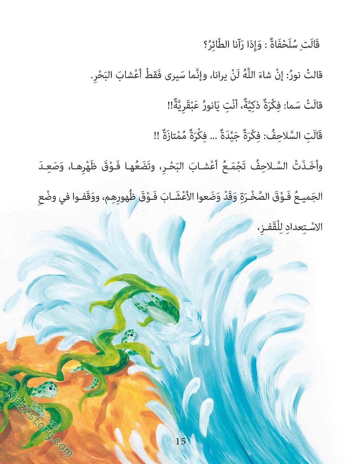 وأخذت السلاحف تجمع أعشاب البحر، وتضعها فوق ظهرها، وصعد الجميع فوق الصخرة وقد وضعوا الأعشاب فوق ظهورهم، ووقفوا في وضع الاستعداد للقفز.