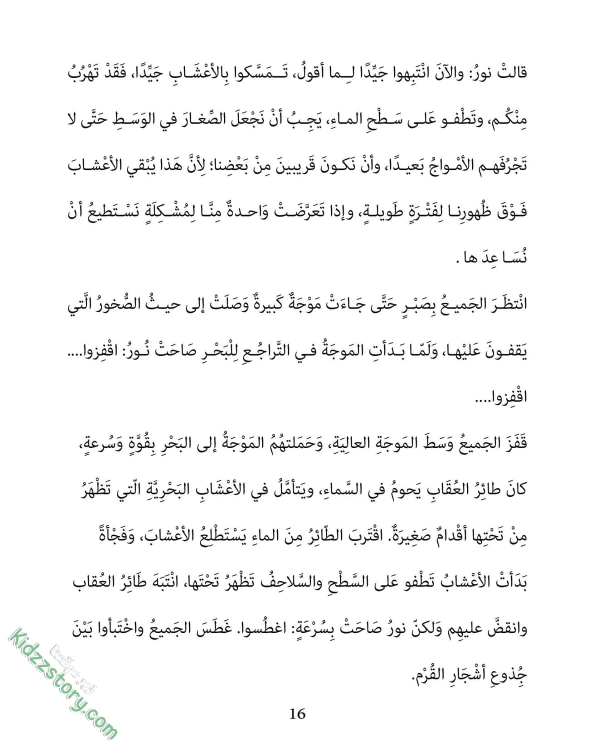 انتظر الجميع بصبر حتى جاءت موجة كبيرة وصلت إلى حيث الصخور التي يقفون عليها. ولما بدأت الموجة في التراجع للبحر، صاحت نور: “اقفزوا…. اقفزوا….”