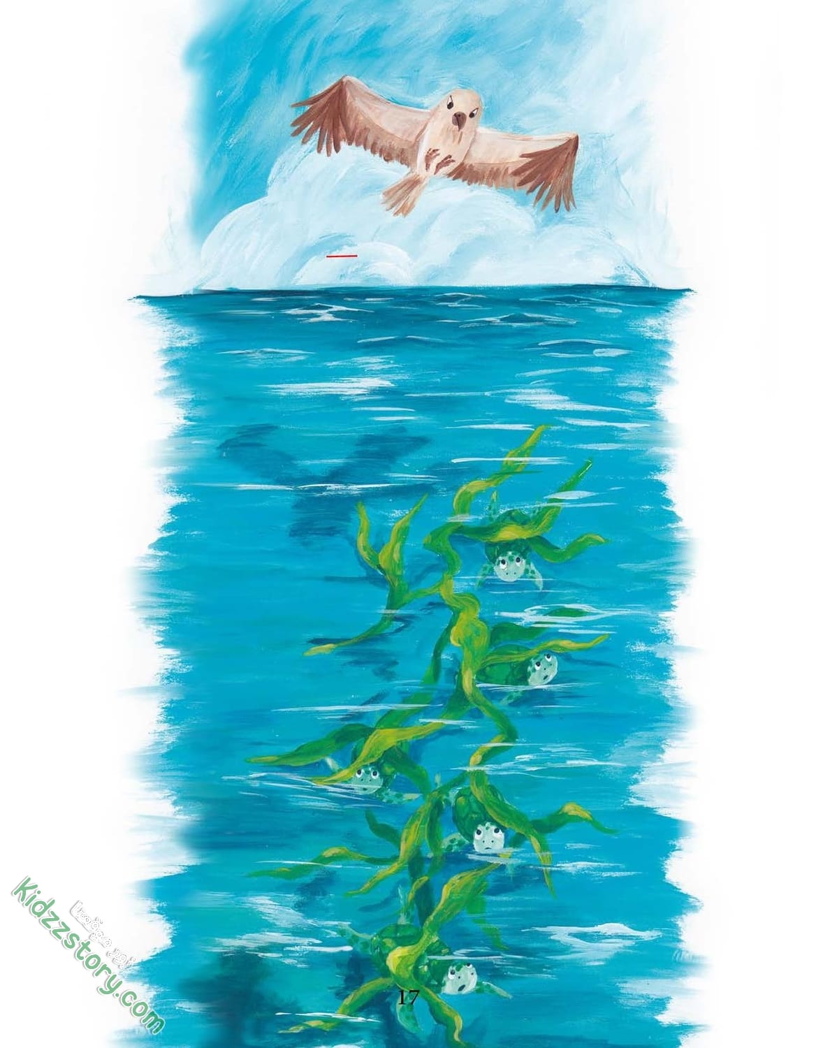 قفز الجميع وسط الموجة العالية، وحملتهم الموجة إلى البحر بقوة وسرعة. كان طائر العقاب يحوم في السماء، ويتأمل في الأعشاب البحرية التي تظهر من تحتها أقدام صغيرة. اقترب الطائر من الماء يستطلع الأعشاب، وفجأة بدأت الأعشاب تطفو على السطح والسلاحف تظهر تحتها. انتبه طائر العقاب وانقض عليهم.