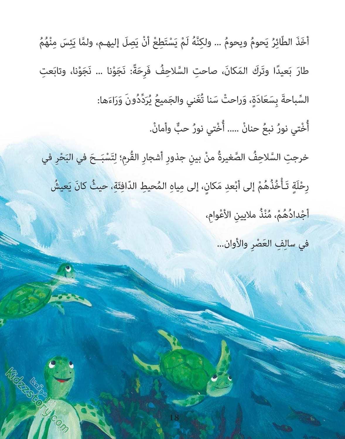 خرجت السلاحف الصغيرة من بين جذور أشجار القرم لتسبح في البحر في رحلة تأخذهم إلى أبعد مكان، إلى مياه المحيط الدافئة، حيث كان يعيش أجدادهم، منذ ملايين الأعوام، في سالف العصر والأوان…