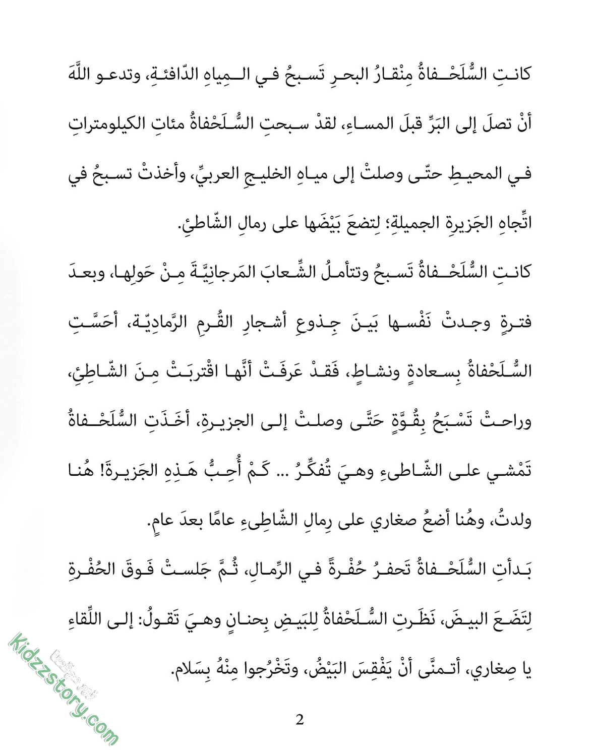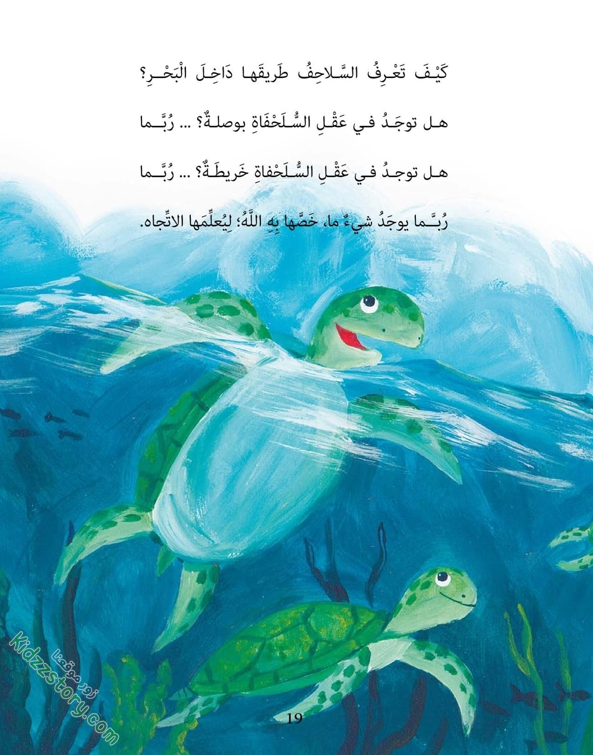 كانت السلحفاة منقار البحر تسبح في المياه الدافئة وتدعو الله أن تصل إلى البر قبل المساء. لقد سبحت السلحفاة مئات الكيلومترات في المحيط حتى وصلت إلى مياه الخليج العربي، وأخذت تسبح في اتجاه الجزيرة الجميلة لتضع بيضها على رمال الشاطئ.