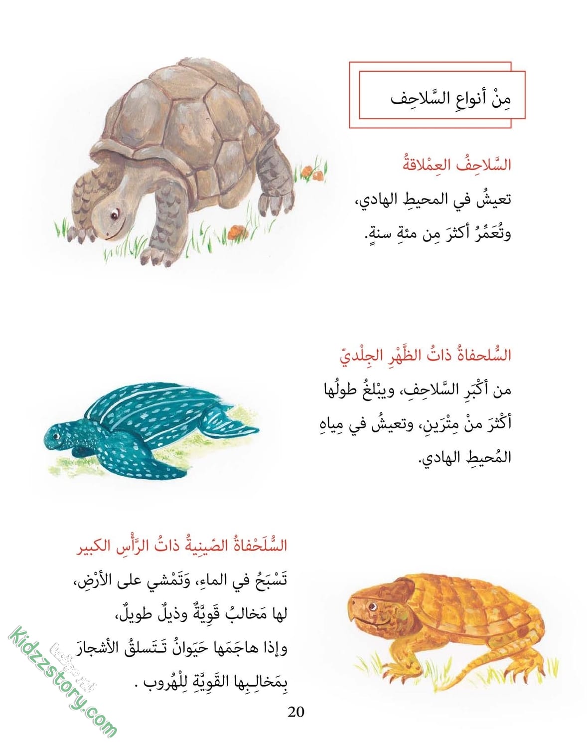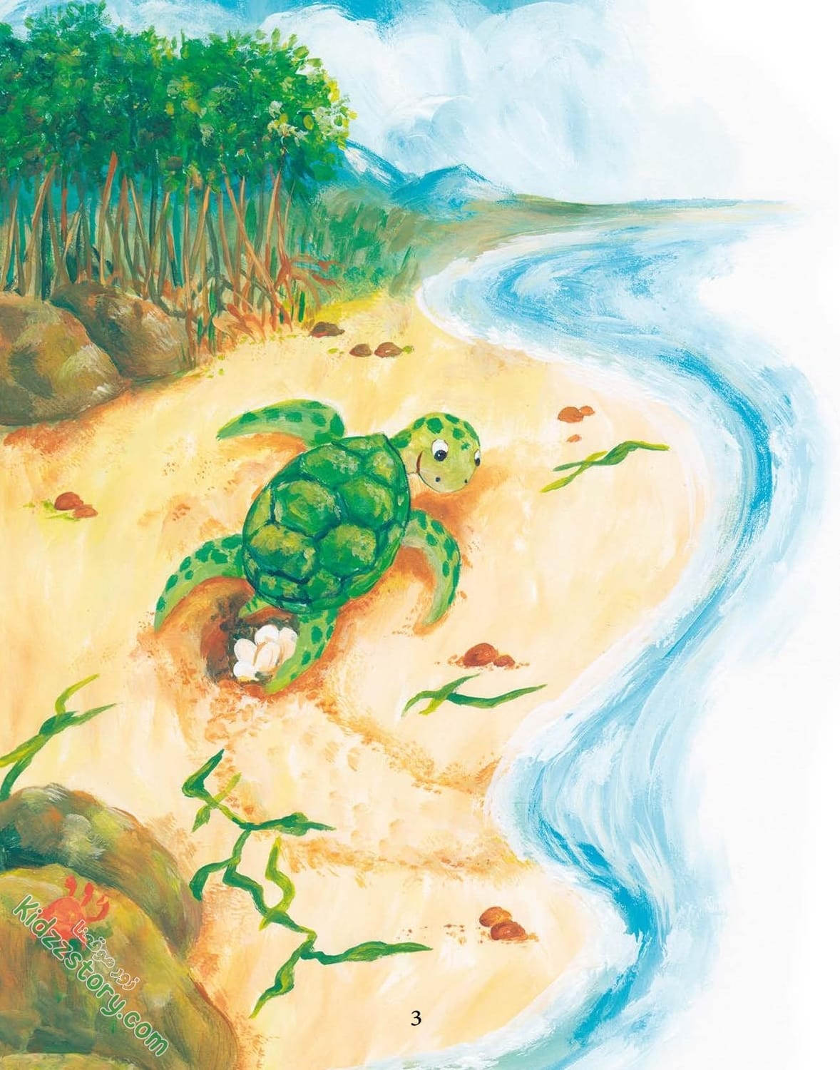 كانت السلحفاة تسبح وتتأمل الشعاب المرجانية من حولها. بعد فترة، وجدت نفسها بين جذوع أشجار القرم الرمادية. أحست السلحفاة بسعادة ونشاط؛ فقد عرفت أنها اقتربت من الشاطئ. راحت تسبح بقوة حتى وصلت إلى الجزيرة. أخذت السلحفاة تمشي على الشاطئ وهي تفكر: “كم أحب هذه الجزيرة! هنا ولدت، وهنا أضع صغاري على رمال الشاطئ عاما بعد عام.”