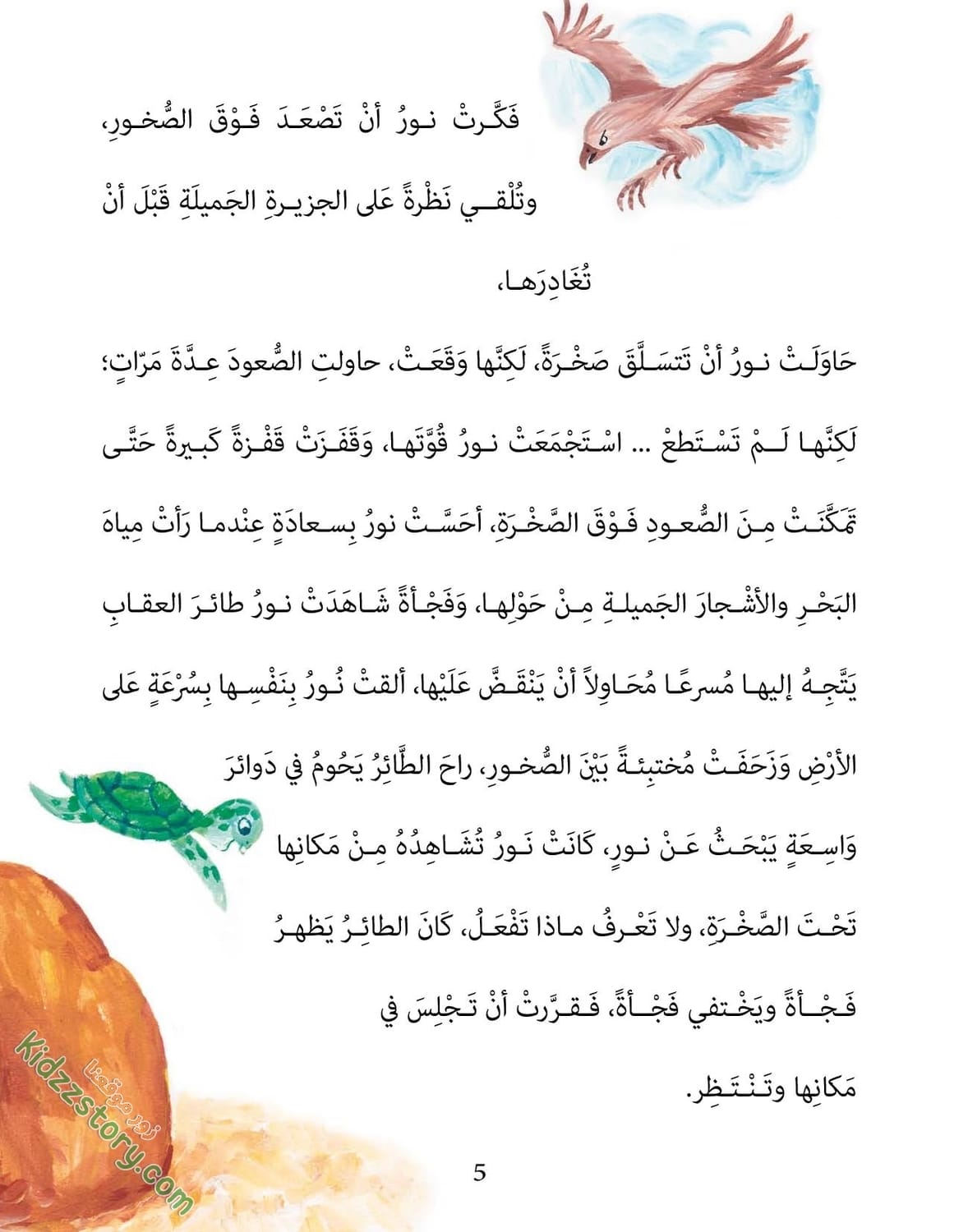 فكرت نور أن تصعد فوق الصخور وتلقي نظرة على الجزيرة الجميلة قبل أن تغادرها. حاولت نور أن تتسلق صخرة، لكنها وقعت. حاولت الصعود عدة مرات لكنها لم تستطع. استجمعت نور قوتها، وقفزت قفزة كبيرة حتى تمكنت من الصعود فوق الصخرة. أحست نور بسعادة عندما رأت مياه البحر والأشجار الجميلة من حولها. وفجأة، شاهدت نور طائر العقاب يتجه إليها مسرعا محاولا أن ينقض عليها. ألقت نور بنفسها بسرعة على الأرض وزحفت مختبئة بين الصخور. راح الطائر يحوم في دوائر واسعة يبحث عن نور. كانت نور تشاهده من مكانها تحت الصخرة، ولا تعرف ماذا تفعل. كان الطائر يظهر فجأة ويختفي فجأة، فقررت أن تجلس في مكانها وتنتظر.