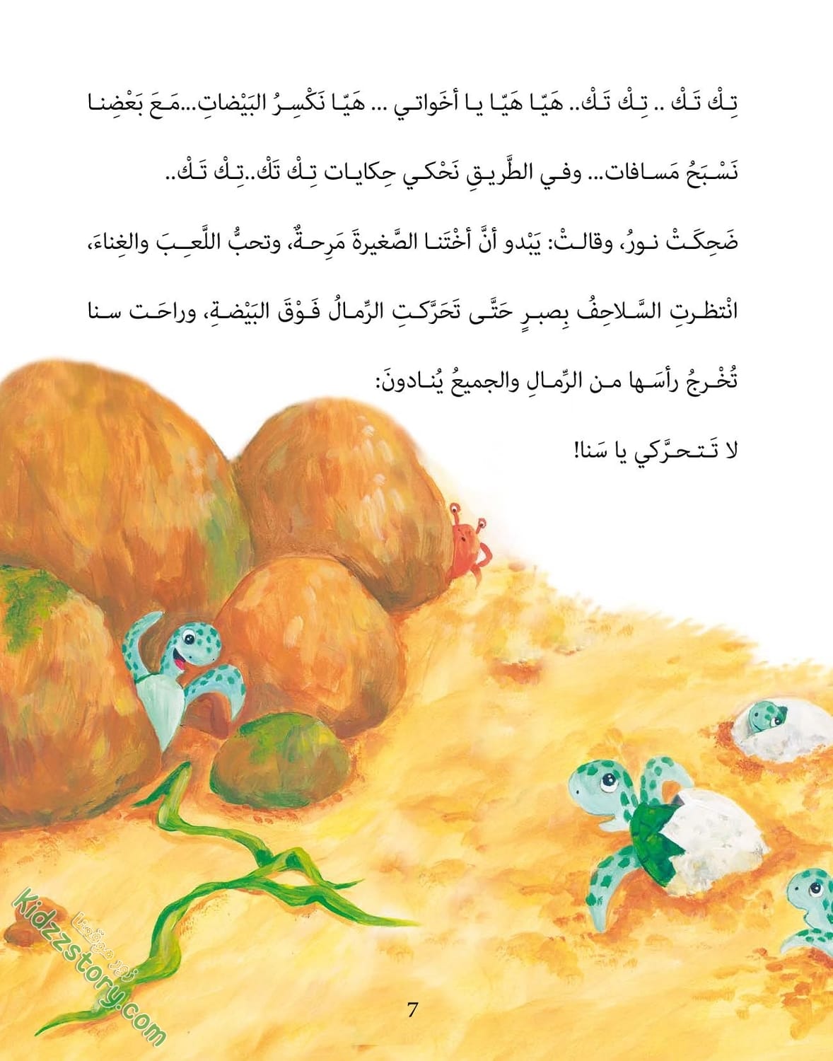 انتظرت السلاحف بصبر حتى تحركت الرمال فوق البيضة، وراحت سنا تخرج رأسها من الرمال والجميع ينادون: “لا تتحركي يا سنا!”