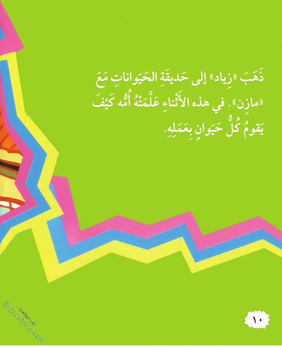 ذهب زياد إلى حديقة الحيوانات مع مازن. في هذه الأثناء علمته أمه كيف يقوم كل حيوان بعمله.