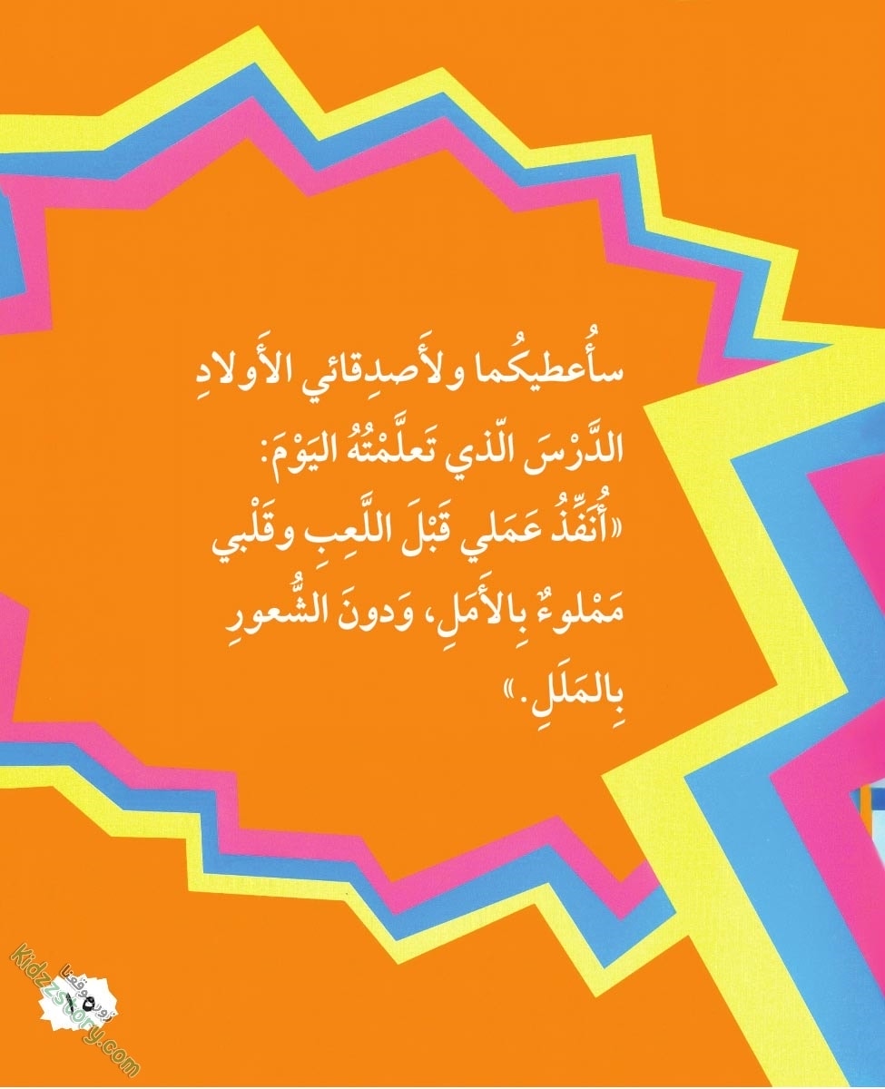 سأعطيكما ولأصدقائي الأولاد الدرس الذي تعلمته اليوم: أنفذ عملي قبل اللعب وقلبي مملوء بالأمل، ودون الشعور بالملل.