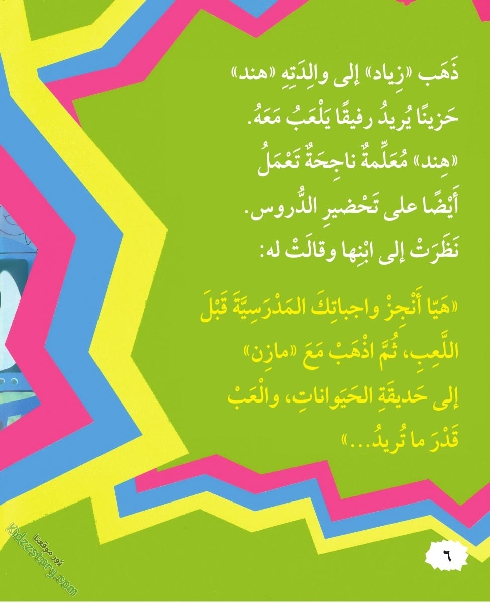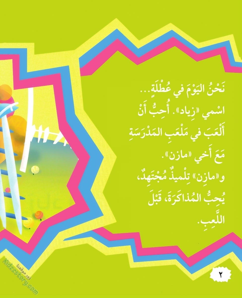 نحن اليوم في عطلة. اسمي زياد. أحب أن ألعب في ملعب المدرسة مع أخي مازن. ومازن تلميذ مجتهد، يحب المذاكرة قبل اللعب.