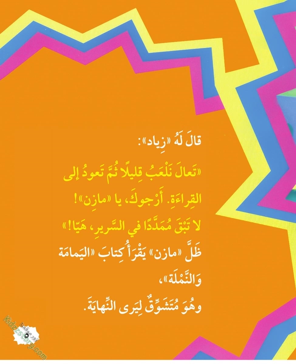 قال له زياد: تعال نلعب قليلا ثم تعود إلى القراءة. أرجوك يا مازن، لا تبق ممددا في السرير، هيا!