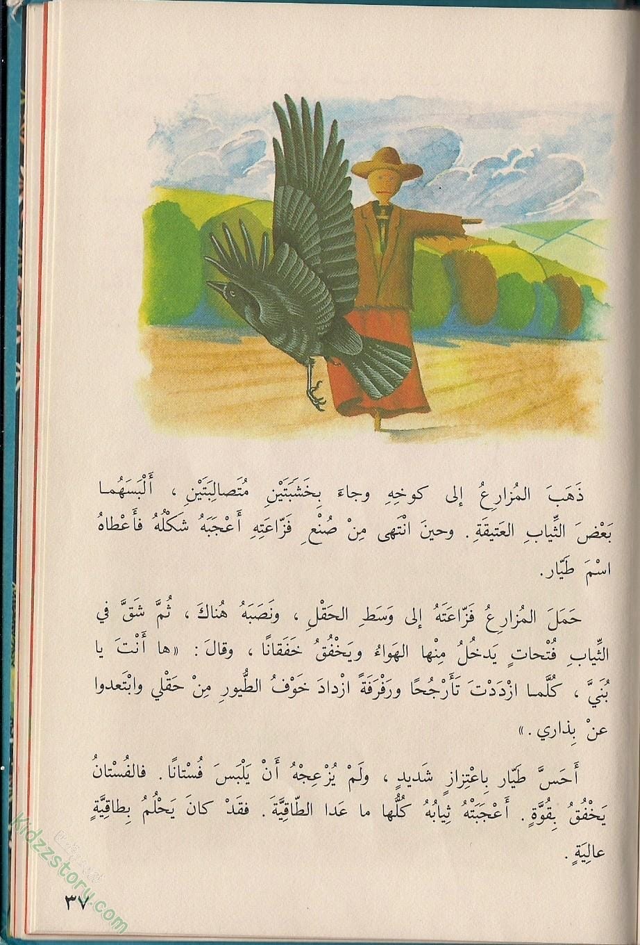 ذهب المزارع إلى كوخه وجاء بخشبتين متصالبتين، ألبسهما بعض الثياب العتيقة. وحين انتهى من صنع فزاعته أعجبه شكله فأعطاه اسم طيار. حمل المزارع فزاعته إلى وسط الحقل، ونصبه هناك، ثم شق في الثياب فتحات يدخل منها الهواء ويخفق خفقانا، وقال: «ها أنت يا بني، كلما ازددت تأرجحا ورفرفة ازداد خوف الطيور من حقلي وابتعدت عن بذاري.»