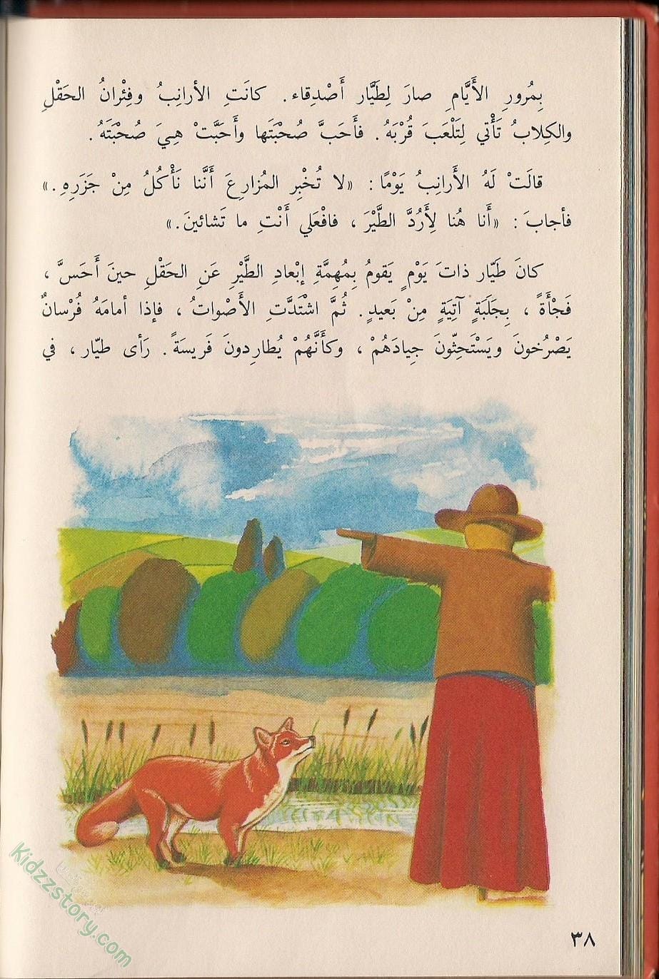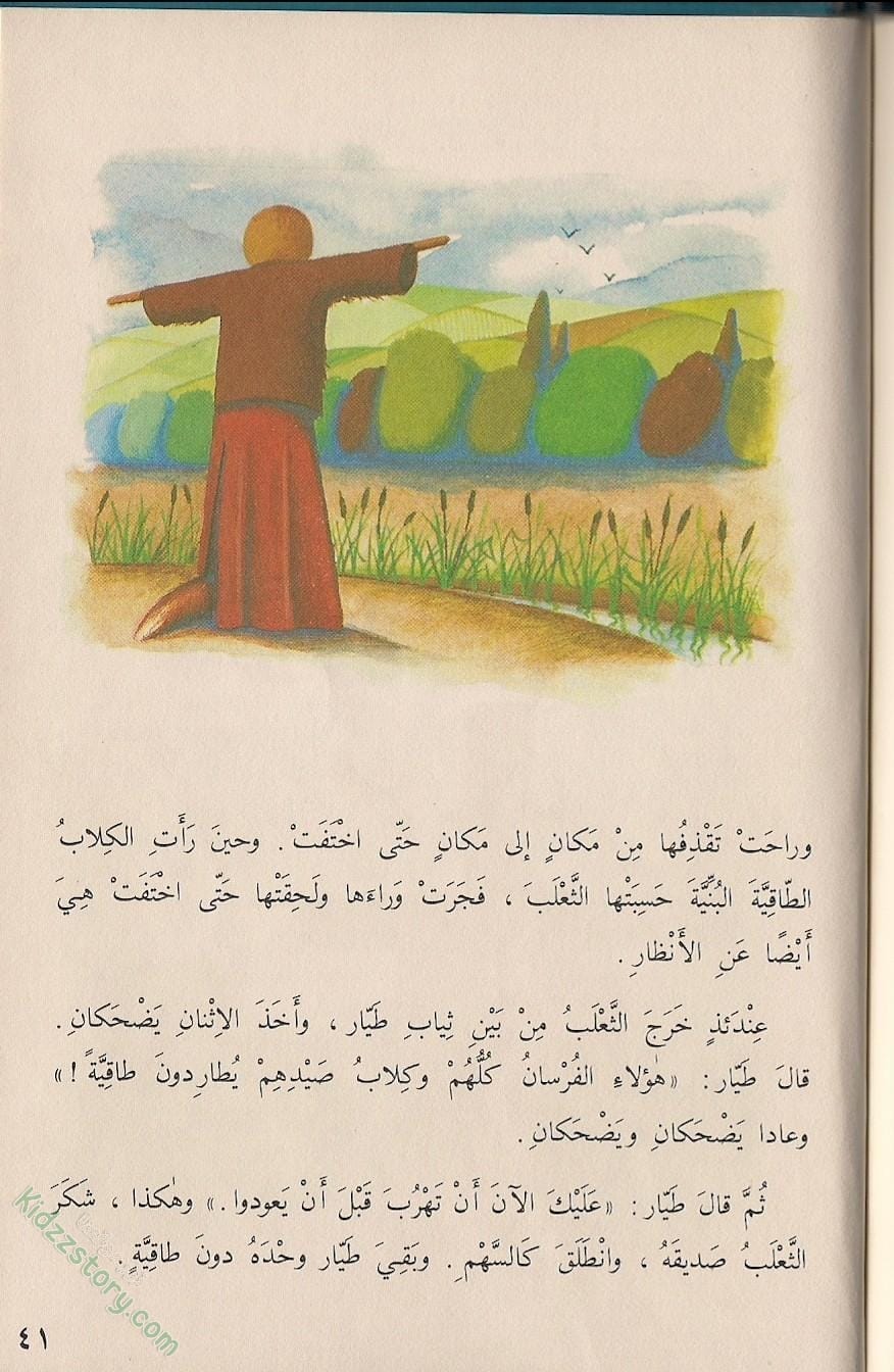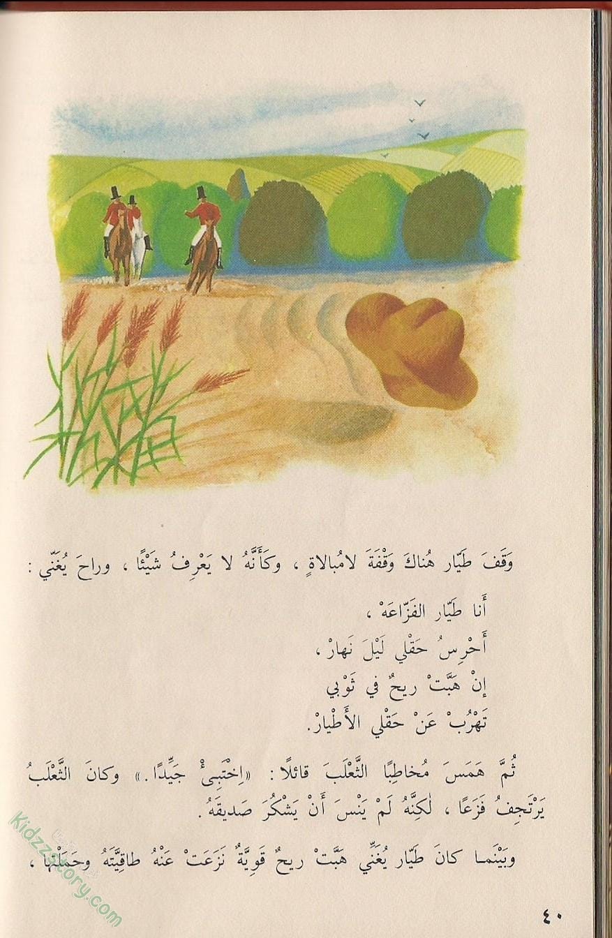 وقف طيار هناك وقفة لامبالاة، وكأنه لا يعرف شيئا، وراح يغني: أنا طيار الفزاعة، أحرص حقلي ليل نهار، إن هبت ريح في ثوبي تهرب عن حقلي الأطيار. ثم همس مخاطبا الثعلب قائلا: «اختبئ جيدا.» وكان الثعلب يرتجف فزعا، لكنه لم ينس أن يشكر صديقه.