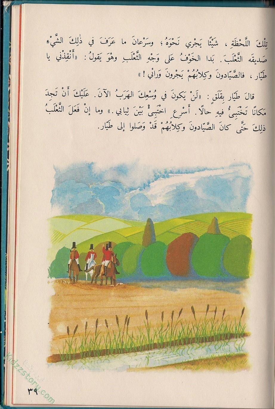 قال طيار بقلق: لن يكون في مسعك الهرب الآن عليك أن تجد مكانا تختبئ فيه حالا. أسرع اختبئ بين ثيابي.» وما إن فعل الثعلب ذلك حتى كان الصيادون وكلابهم قد وصلوا إلى طيار.