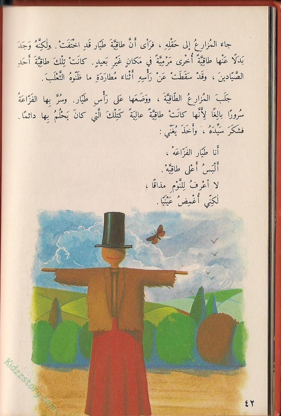 جلب المزارع الطاقية، ووضعها على رأس طيار. وسر بها الفزاعة سرورا بالغا لأنها كانت طاقية عالية كتلك التي كان يحلم بها دائما. فشكر سيده، وأخذ يغني: أنا طيار الفزاعة ألبس أعلى طاقية، لا أعرف للنوم مذاقا لكني أغمض عيني.