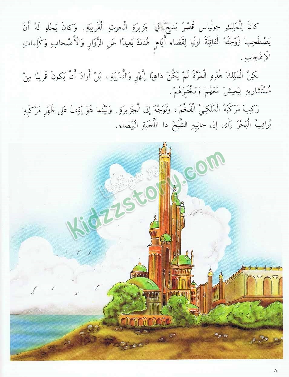 كان للملك جونياس قصر بديع في جزيرة الحوت القريبة. وكان يحلو له أن يصطحب زوجته الفاتنة لونيا لقضاء أيام هناك بعيدًا عن الزوار والأصحاب وكلمات الإعجاب. لكن الملك هذه المرة لم يكن ذاهبًا للهو والتسلية، بل أراد أن يكون قريبًا من مستشاريه ليعيش معهم ويختبرهم.