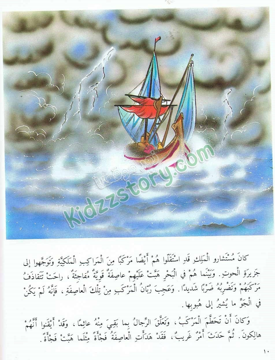 كان مستشارو الملك قد استقلوا هم أيضاً مركباً من المراكب الملكية وتوجهوا إلى جزيرة الحوت. وبينما هم في البحر هبت عليهم عاصفة قوية مفاجئة، راحت تتقاذف مركبهم وتضربه ضرباً شديداً، وعجب ربان المركب من تلك العاصفة، فإنه لم يكن في الجو ما يشير إلى هبوبها. تحطم المركب، وتعلق الرجال بما بقي منه عائماً، وقد أيقنوا أنهم هالكون. ثم حدث أمر غريب، فقد هدأت العاصفة فجأة مثلما هبت فجأة.