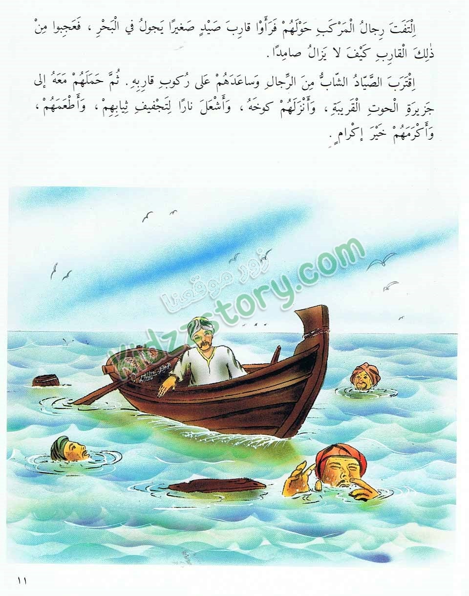 التفت رجال المركب حولهم فرأوا قارب صيد صغيراً يجول في البحر، فعجبوا من ذلك القارب كيف لا يزال صامداً. اقترب الصياد الشاب من الرجال وساعدهم على ركوب قاربه. ثم حملهم معه إلى جزيرة الحوت القريبة، وأنزلهم كوخه، وأشعل ناراً لتجفيف ثيابهم، وأطعمهم، وأكرمهم خير إكرام.