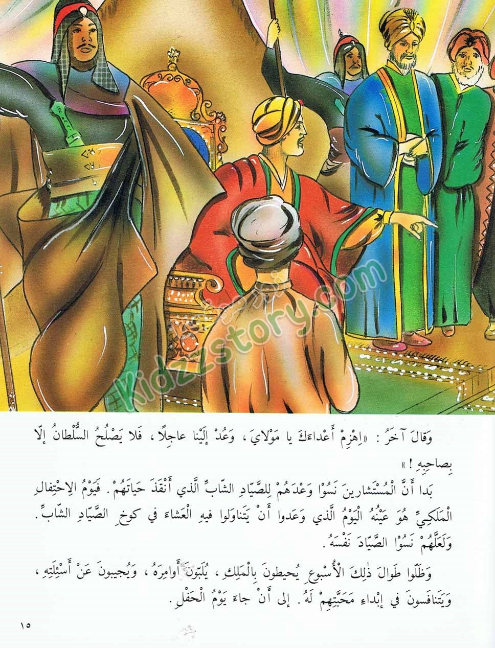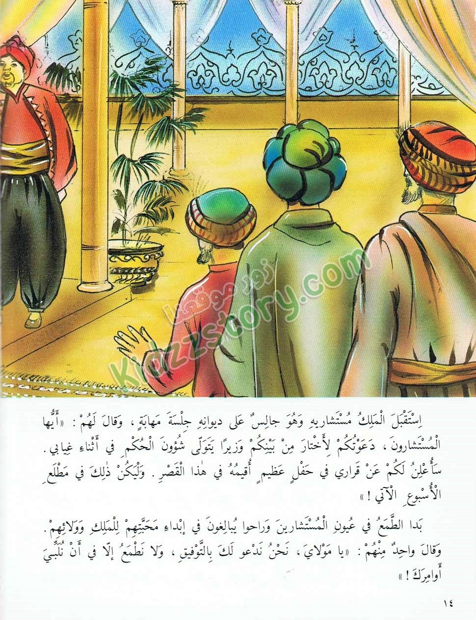 استقبل الملك مستشاريه وهو جالس على ديوانه جلسة مهابة، وقال لهم: “أيها المستشارون، دعوتكم لأختار من بينكم وزيراً يتولى شؤون الحكم في أثناء غيابي. سأعلن لكم عن قراري في حفل عظيم أقيمه في هذا القصر. وليكن ذلك في مطلع الأسبوع الآتي!”