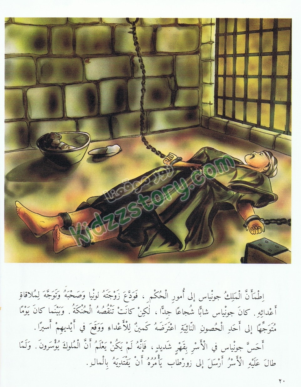 اطمأن الملك جونياس إلى أمور الحكم، فودع زوجته لونيا وصحبه وتوجه لملاقاة أعدائه. كان جونياس شابًا شجاعًا جدًا، لكن كانت تنقصه الحنكة. وبينما كان يومًا متوجهًا إلى أحد الحصون النائية، اعترضه كمين للأعداء ووقع في أيديهم أسيرًا. أحس جونياس في الأسر بقهر شديد، فإنه لم يكن يعلم أن الملوك يؤسرون. ولما طال عليه الأسر أرسل إلى زورطاب يأمره أن يفتديه بالمال.