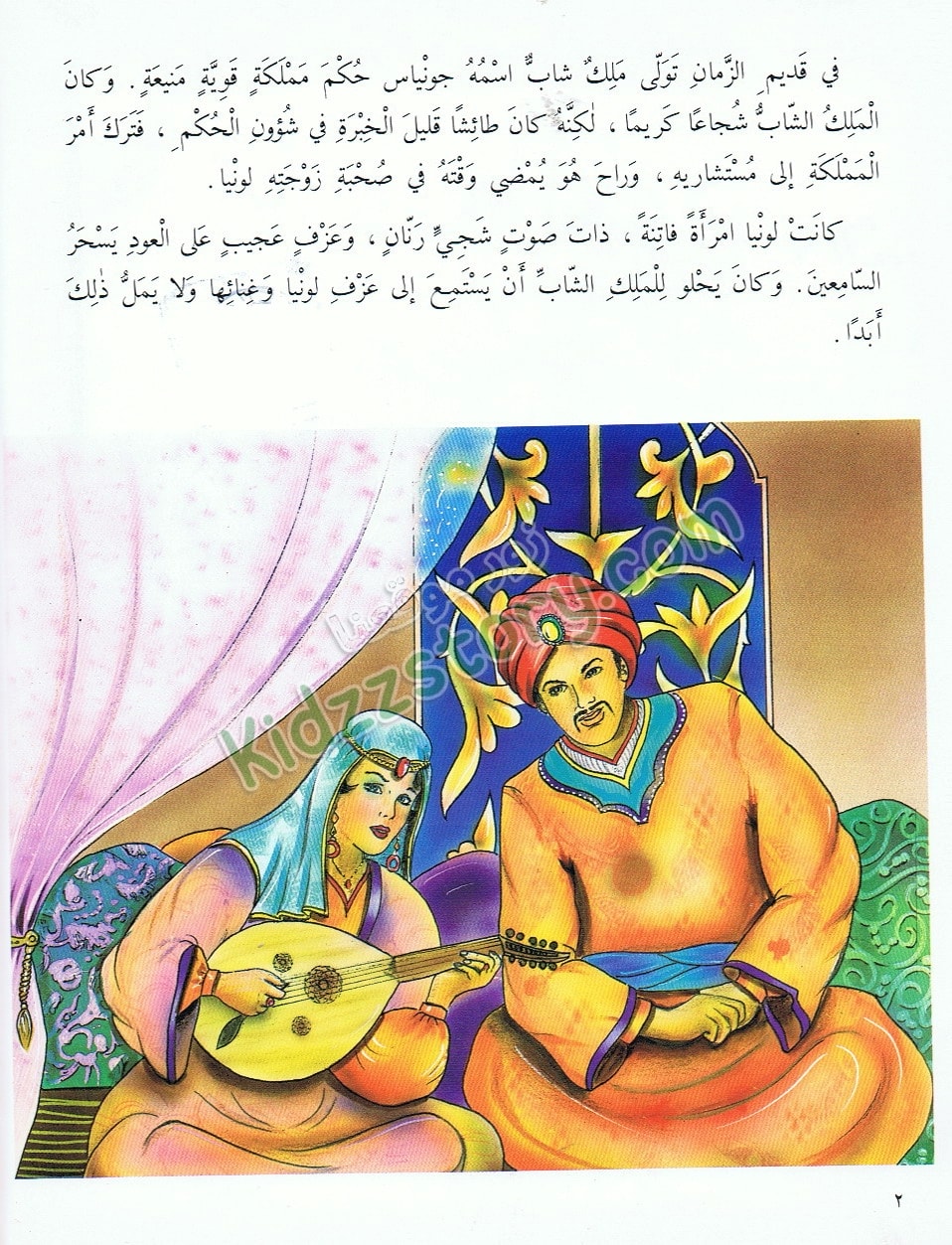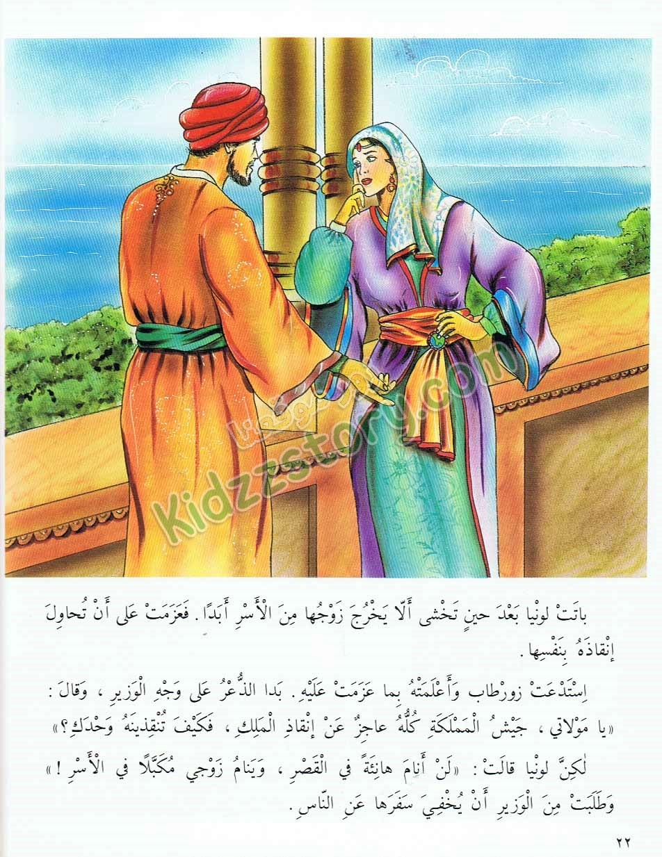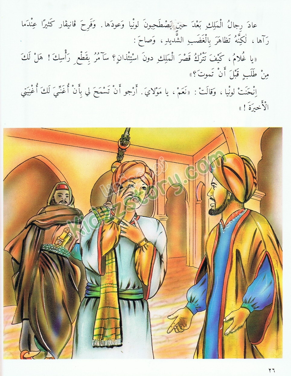 – “يا مولاي، لعل الغلام عازف العود هو لونيا زوجة الملك جونياس متنكرة. فلقد ذاع بين الناس أن لها صوتًا ساحرًا وعزفًا عجيبًا. إذا شئت لحقنا بها وبزوجها وقتلناهما!”