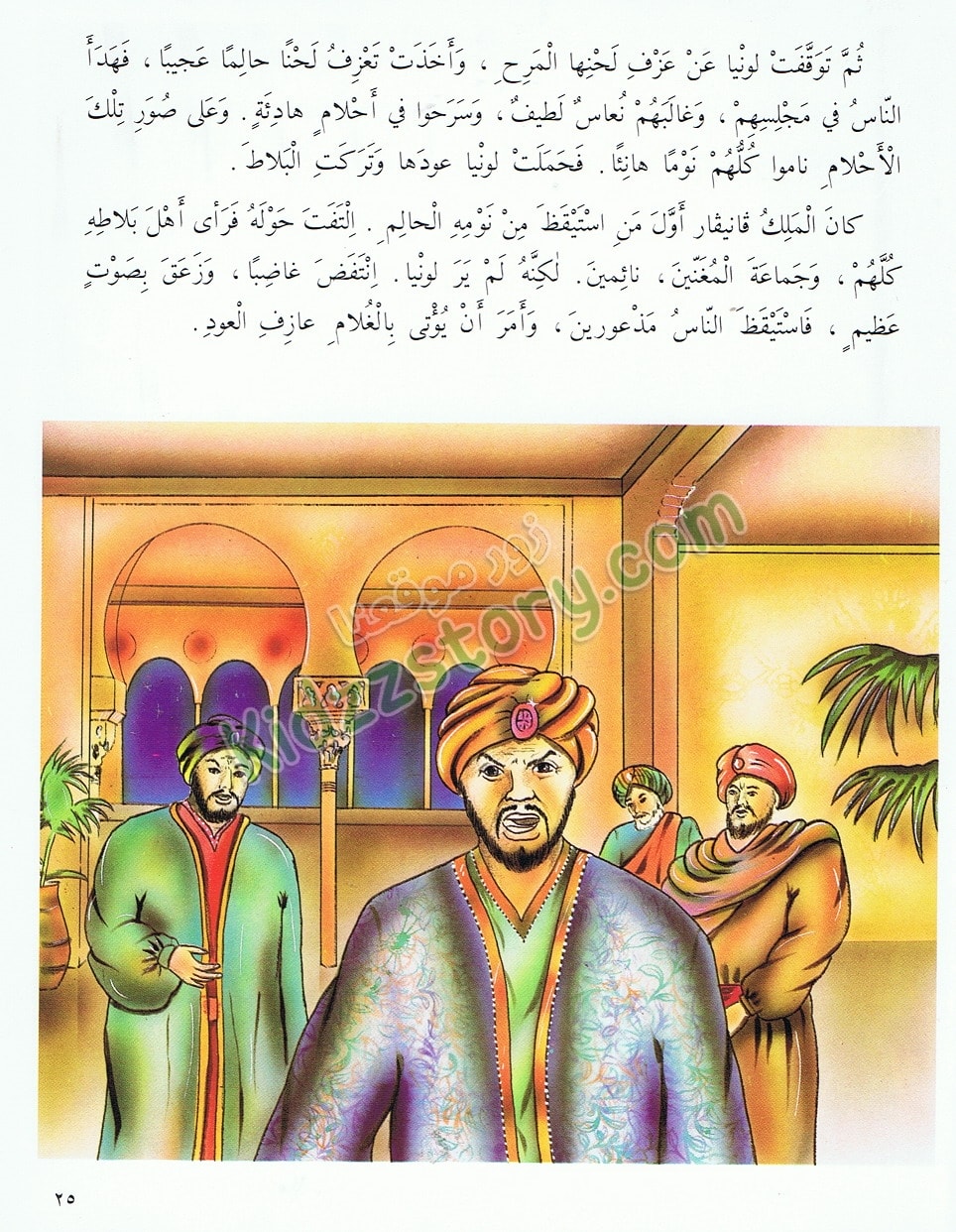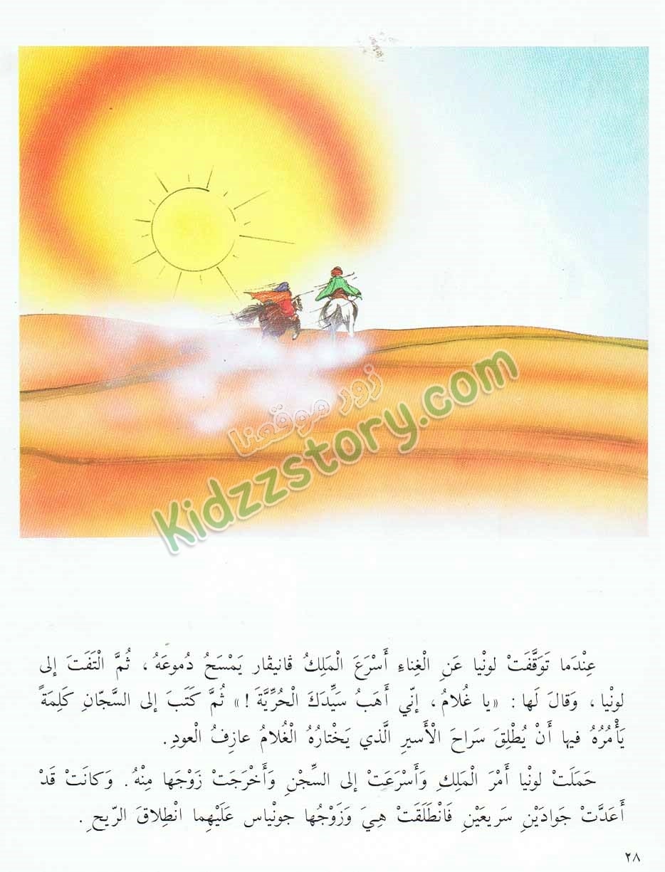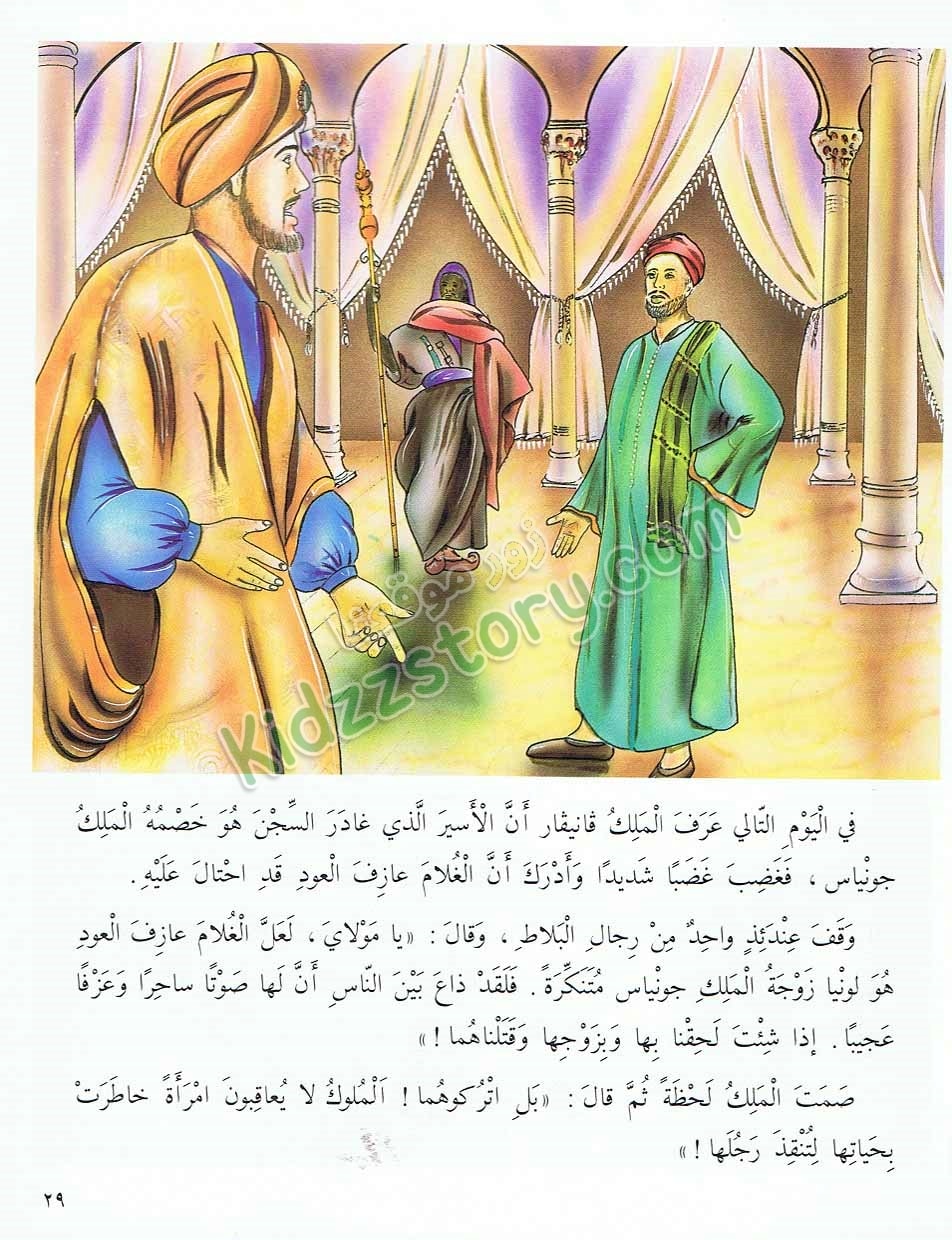 – “يا مولاي، لعل الغلام عازف العود هو لونيا زوجة الملك جونياس متنكرة. فلقد ذاع بين الناس أن لها صوتًا ساحرًا وعزفًا عجيبًا. إذا شئت لحقنا بها وبزوجها وقتلناهما!”