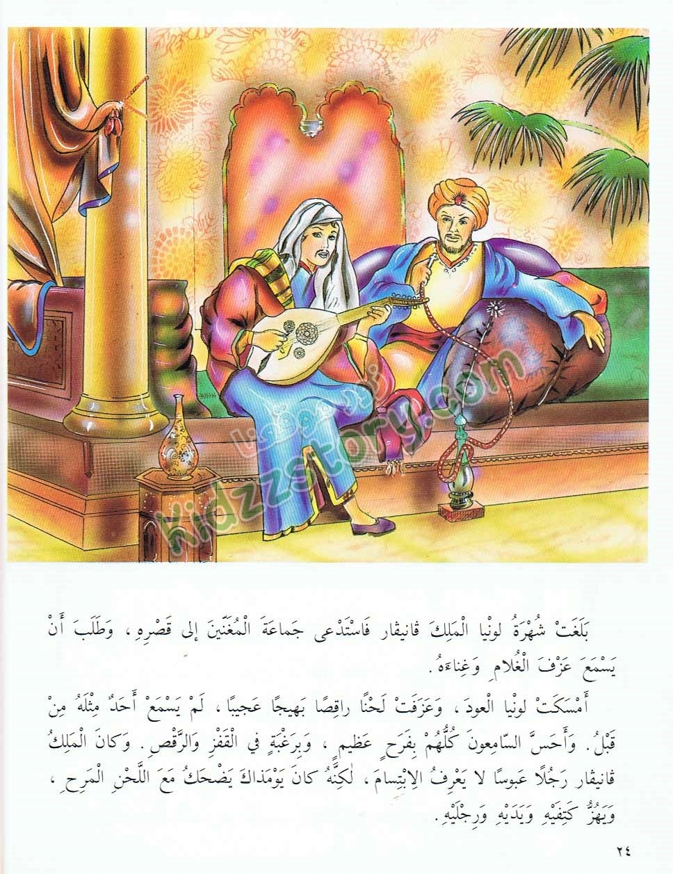 ثم كتب إلى السجان كلمة يأمره فيها أن يطلق سراح الأسير الذي يختاره الغلام عازف العود.