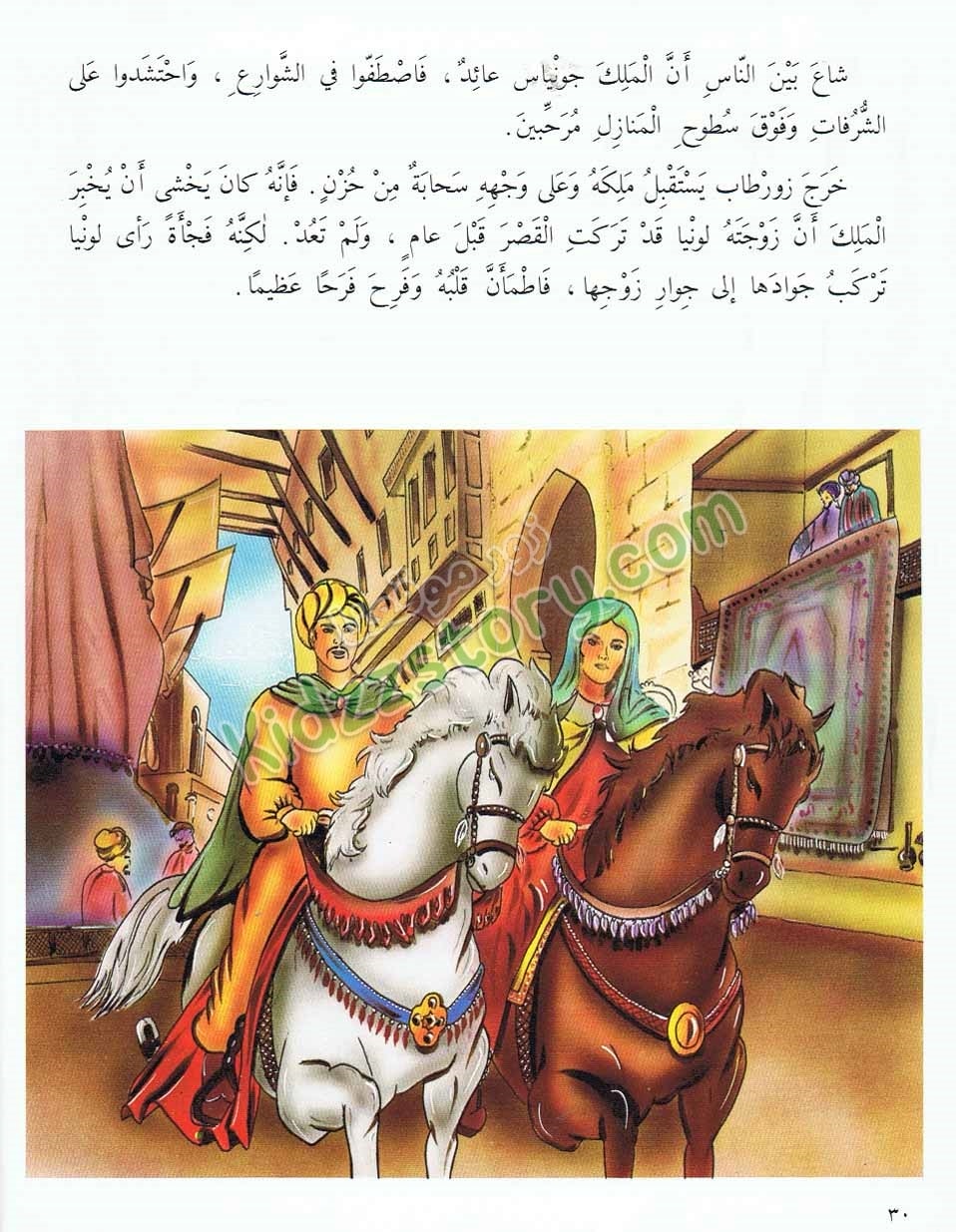 شاع بين الناس أن الملك جونياس عائد، فاصطفوا في الشوارع، واحتشدوا على الشرفات وفوق سطوح المنازل مرحبين. خرج زورطاب يستقبل ملكه وعلى وجهه سحابة من حزن. فإنه كان يخشى أن يخبر الملك أن زوجته لونيا قد تركت القصر قبل عام، ولم تعد. لكنه فجأة رأى لونيا تركب جوادها إلى جوار زوجها، فاطمأن قلبه وفرح فرحًا عظيمًا.