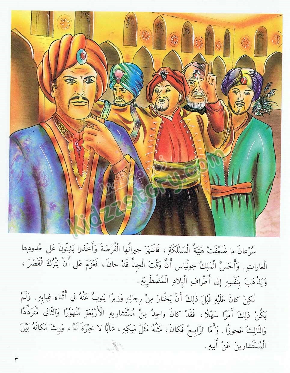 بدا الطمع في عيون المستشارين وراحوا يبالغون في إبداء محبتهم للملك وولائهم. قال واحد منهم: “يا مولاي، نحن ندعو لك بالتوفيق، ولا نطمع إلا في أن نلبي أوامرك!” وقال آخر: “اهزم أعداءك يا مولاي، وعد إلينا عاجلاً، فلا يصلح السلطان إلا بصاحبه!”