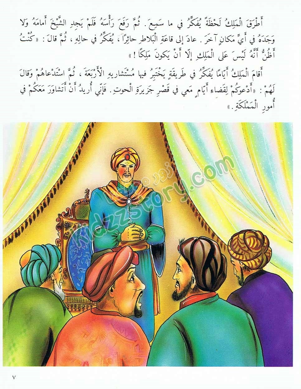 أقام الملك أيامًا يفكر في طريقة يختبر فيها مستشاريه الأربعة، ثم استدعاهم وقال لهم: “أدعوكم لقضاء أيام معي في قصر جزيرة الحوت. فإني أريد أن أتشاور معكم في أمور المملكة.”